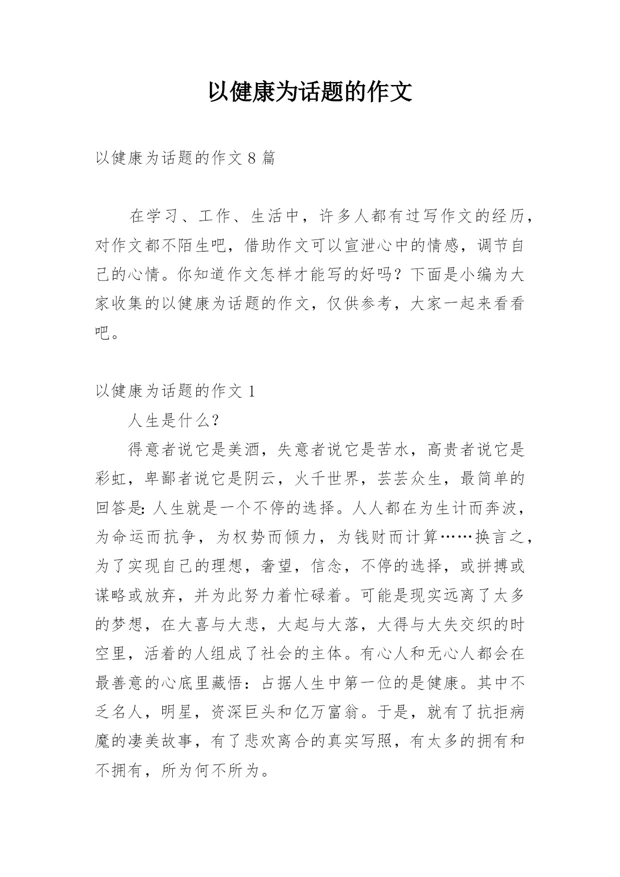 以健康为话题的作文以健康为话题的作文8篇在学习、工作、生活中,许多人都有过写作文的经历,对作文都不陌生吧,借助作文可以宣泄心中的情感,调节自己的心情。你知道作文怎样才能写的好吗?下面是小编为大家收集的以健康为话题的作文,仅供参考,大家一起来看看吧。以健康为话题的作文1人生是什么?得意者说它是美酒,失意者说它是苦水,高贵者说它是彩虹,卑鄙者说它是阴云,火千世界,芸芸众生,最简单的回答是:人生就是一个不停的选择。人人都在为生计而奔波,为命运而抗争,为权势而倾力,为钱财而计算……换言之,为了实现自己的理想,奢望