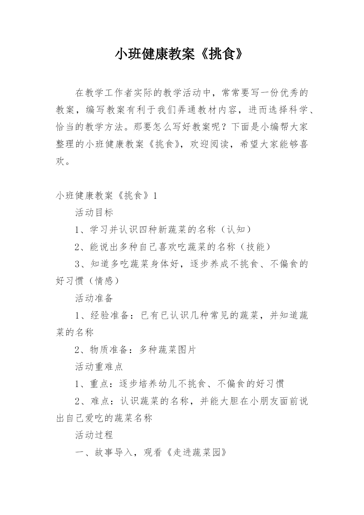 小班健康教案《挑食》在教学工作者实际的教学活动中,常常要写一份优秀的教案,编写教案有利于我们弄通教材内容,进而选择科学、恰当的教学方法。那要怎么写好教案呢?下面是小编帮大家整理的小班健康教案《挑食》,欢迎阅读,希望大家能够喜欢。小班健康教案《挑食》1活动目标1、学习并认识四种新蔬菜的名称(认知)2、能说出多种自己喜欢吃蔬菜的名称(技能)3、知道多吃蔬菜身体好,逐步养成不挑食、不偏食的好习惯(情感)活动准备1、经验准备:已有已认识几种常见的蔬菜,并知道蔬菜的名称2、物质准备:多种蔬菜图片活动重难点1、重点: