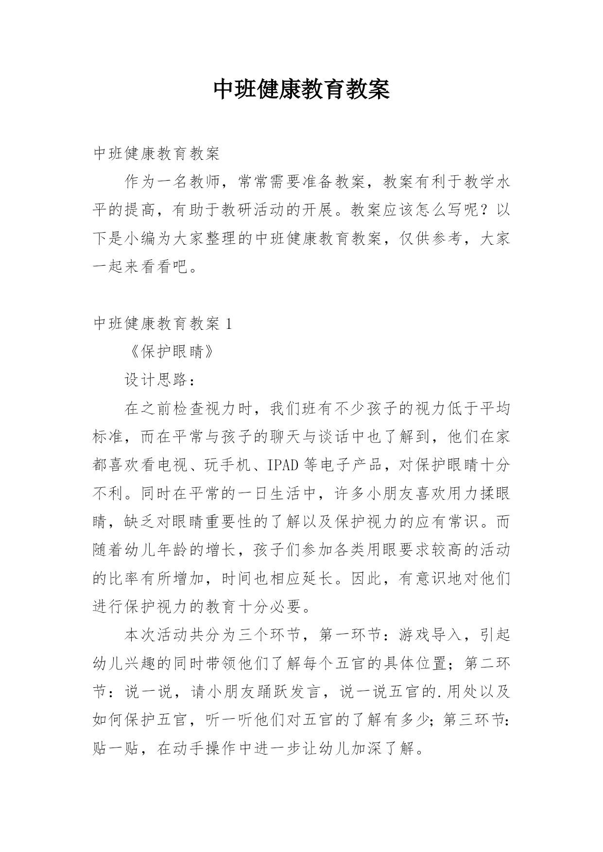 中班健康教育教案中班健康教育教案作为一名教师,常常需要准备教案,教案有利于教学水平的提高,有助于教研活动的开展。教案应该怎么写呢?以下是小编为大家整理的中班健康教育教案,仅供参考,大家一起来看看吧。中班健康教育教案1《保护眼睛》设计思路:在之前检查视力时,我们班有不少孩子的视力低于平均标准,而在平常与孩子的聊天与谈话中也了解到,他们在家都喜欢看电视、玩手机、IPAD等电子产品,对保护眼睛十分不利。同时在平常的一日生活中,许多小朋友喜欢用力揉眼睛,缺乏对眼睛重要性的了解以及保护视力的应有常识。而随着幼儿年龄