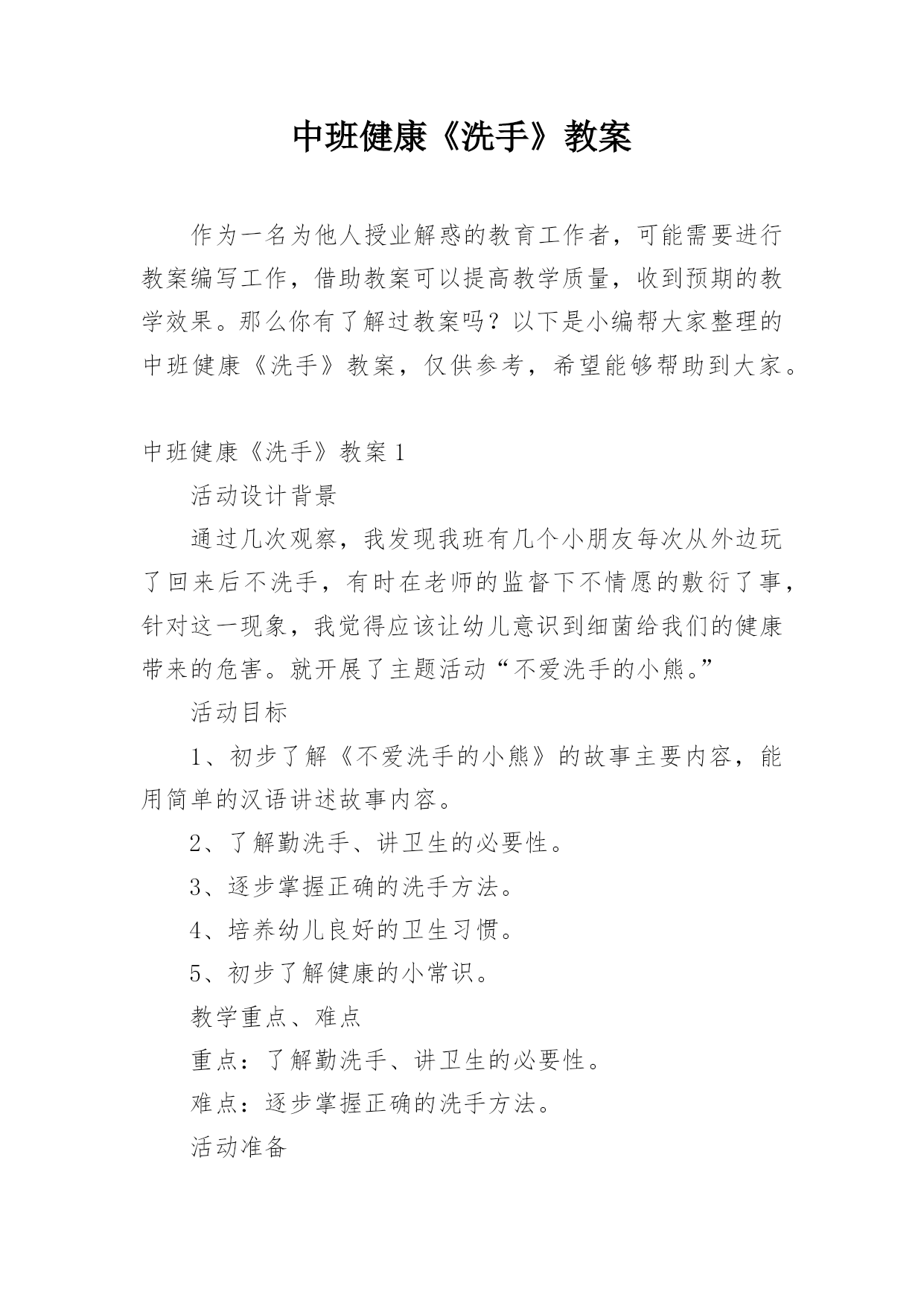 中班健康《洗手》教案作为一名为他人授业解惑的教育工作者,可能需要进行教案编写工作,借助教案可以提高教学质量,收到预期的教学效果。那么你有了解过教案吗?以下是小编帮大家整理的中班健康《洗手》教案,仅供参考,希望能够帮助到大家。中班健康《洗手》教案1活动设计背景通过几次观察,我发现我班有几个小朋友每次从外边玩了回来后不洗手,有时在老师的监督下不情愿的敷衍了事,针对这一现象,我觉得应该让幼儿意识到细菌给我们的健康带来的危害。就开展了主题活动“不爱洗手的小熊。”活动目标1、初步了解《不爱洗手的小熊》的故事主要内容