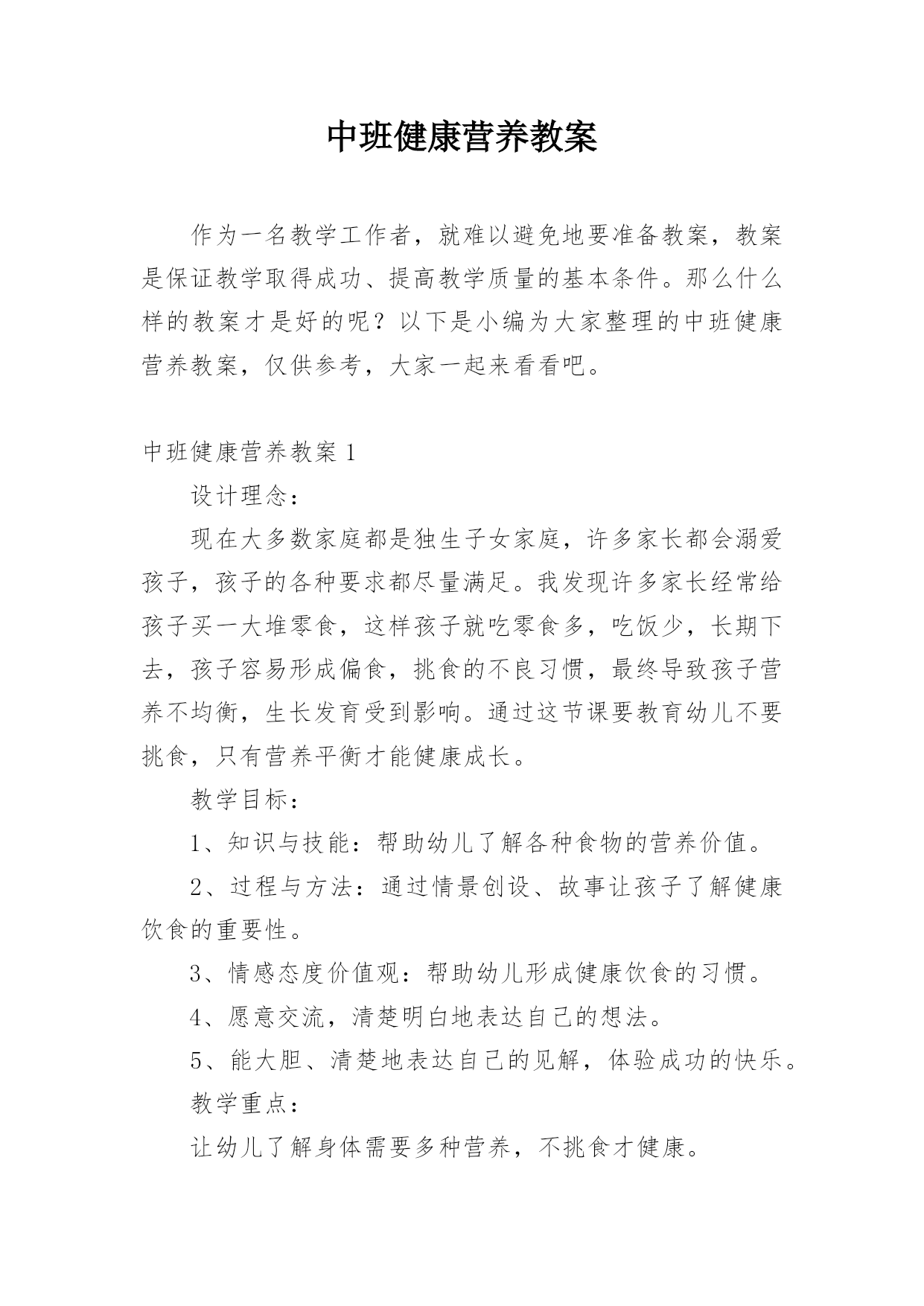 中班健康营养教案作为一名教学工作者,就难以避免地要准备教案,教案是保证教学取得成功、提高教学质量的基本条件。那么什么样的教案才是好的呢?以下是小编为大家整理的中班健康营养教案,仅供参考,大家一起来看看吧。中班健康营养教案1设计理念:现在大多数家庭都是独生子女家庭,许多家长都会溺爱孩子,孩子的各种要求都尽量满足。我发现许多家长经常给孩子买一大堆零食,这样孩子就吃零食多,吃饭少,长期下去,孩子容易形成偏食,挑食的不良习惯,最终导致孩子营养不均衡,生长发育受到影响。通过这节课要教育幼儿不要挑食,只有营养平衡才能