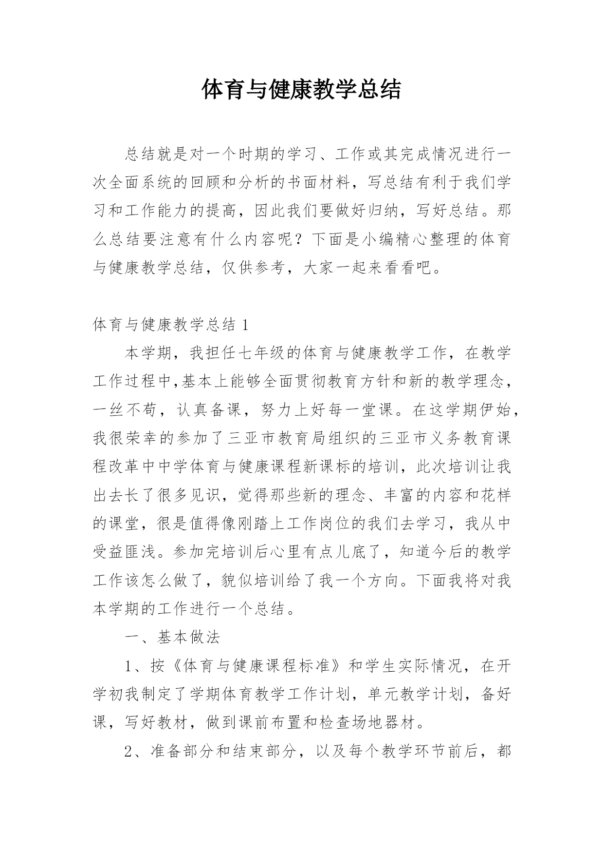 体育与健康教学总结总结就是对一个时期的学习、工作或其完成情况进行一次全面系统的回顾和分析的书面材料,写总结有利于我们学习和工作能力的提高,因此我们要做好归纳,写好总结。那么总结要注意有什么内容呢?下面是小编精心整理的体育与健康教学总结,仅供参考,大家一起来看看吧。体育与健康教学总结1本学期,我担任七年级的体育与健康教学工作,在教学工作过程中,基本上能够全面贯彻教育方针和新的教学理念,一丝不苟,认真备课,努力上好每一堂课。在这学期伊始,我很荣幸的参加了三亚市教育局组织的三亚市义务教育课程改革中中学体育与健康
