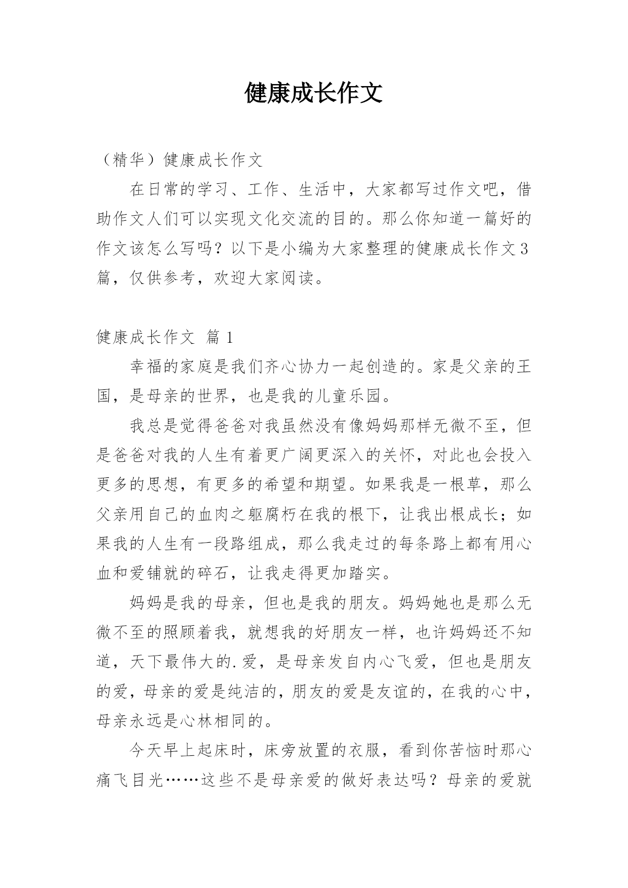 健康成长作文(精华)健康成长作文在日常的学习、工作、生活中,大家都写过作文吧,借助作文人们可以实现文化交流的目的。那么你知道一篇好的作文该怎么写吗?以下是小编为大家整理的健康成长作文3篇,仅供参考,欢迎大家阅读。健康成长作文篇1幸福的家庭是我们齐心协力一起创造的。家是父亲的王国,是母亲的世界,也是我的儿童乐园。我总是觉得爸爸对我虽然没有像妈妈那样无微不至,但是爸爸对我的人生有着更广阔更深入的关怀,对此也会投入更多的思想,有更多的希望和期望。如果我是一根草,那么父亲用自己的血肉之躯腐朽在我的根下,让我出根成