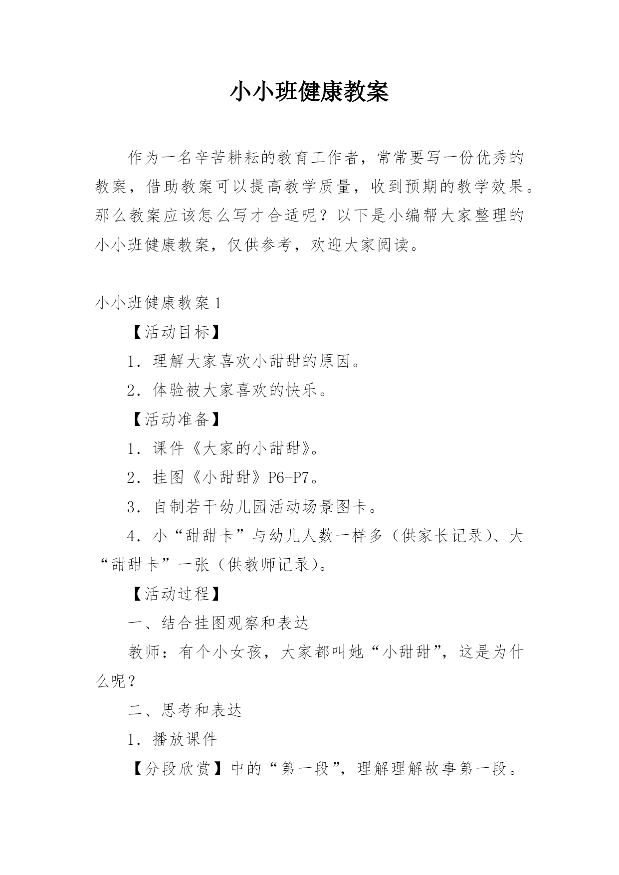 小小班健康教案作为一名辛苦耕耘的教育工作者,常常要写一份优秀的教案,借助教案可以提高教学质量,收到预期的教学效果。那么教案应该怎么写才合适呢?以下是小编帮大家整理的小小班健康教案,仅供参考,欢迎大家阅读。小小班健康教案1【活动目标】1.理解大家喜欢小甜甜的原因。2.体验被大家喜欢的快乐。【活动准备】1.课件《大家的小甜甜》。2.挂图《小甜甜》P6-P7。3.自制若干幼儿园活动场景图卡。4.小“甜甜卡”与幼儿人数一样多(供家长记录)、大“甜甜卡”一张(供教师记录)。【活动过程】一、结合挂图观察和表达教师:有