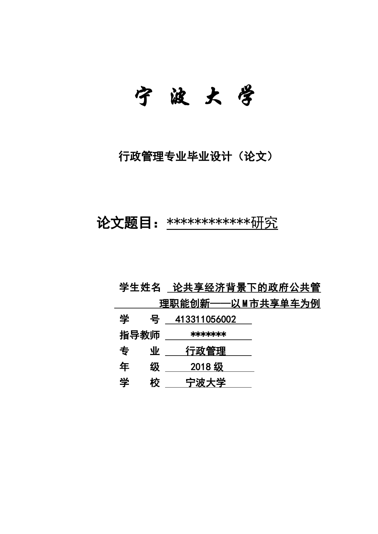 宁波大学行政管理专业毕业设计(论文)论文题目:************研究学生姓名论共享经济背景下的政府公共管理职能创新——以M市共享单车为例学号413311056002指导教师*******专业行政管理年级2018级学校宁波大学摘要:2016年,ofo共享单车走出校园,摩拜单车走出北上广深,各大城市也纷纷投入各种颜色的单车。共享单车作为一种新形式的交通工具因为它的方便性和灵活性而受到极大的欢迎。各大公司纷纷投入共享单车,由于资本市场的涌入,共享单车迅速发展,规模不断扩大。共享单车的粗暴发展带来了一系列的