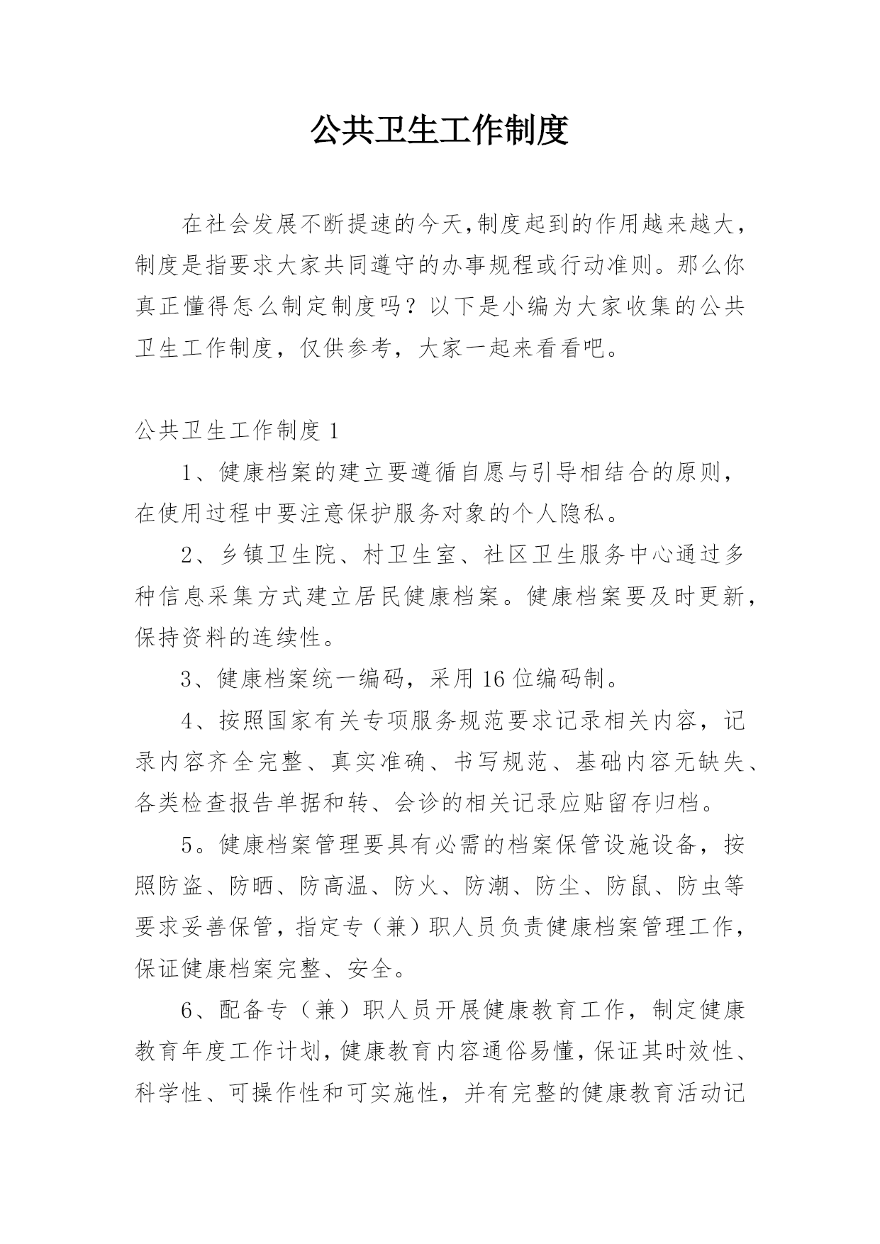 公共卫生工作制度在社会发展不断提速的今天,制度起到的作用越来越大,制度是指要求大家共同遵守的办事规程或行动准则。那么你真正懂得怎么制定制度吗?以下是小编为大家收集的公共卫生工作制度,仅供参考,大家一起来看看吧。公共卫生工作制度11、健康档案的建立要遵循自愿与引导相结合的原则,在使用过程中要注意保护服务对象的个人隐私。2、乡镇卫生院、村卫生室、社区卫生服务中心通过多种信息采集方式建立居民健康档案。健康档案要及时更新,保持资料的连续性。3、健康档案统一编码,采用16位编码制。4、按照国家有关专项服务规范要求记