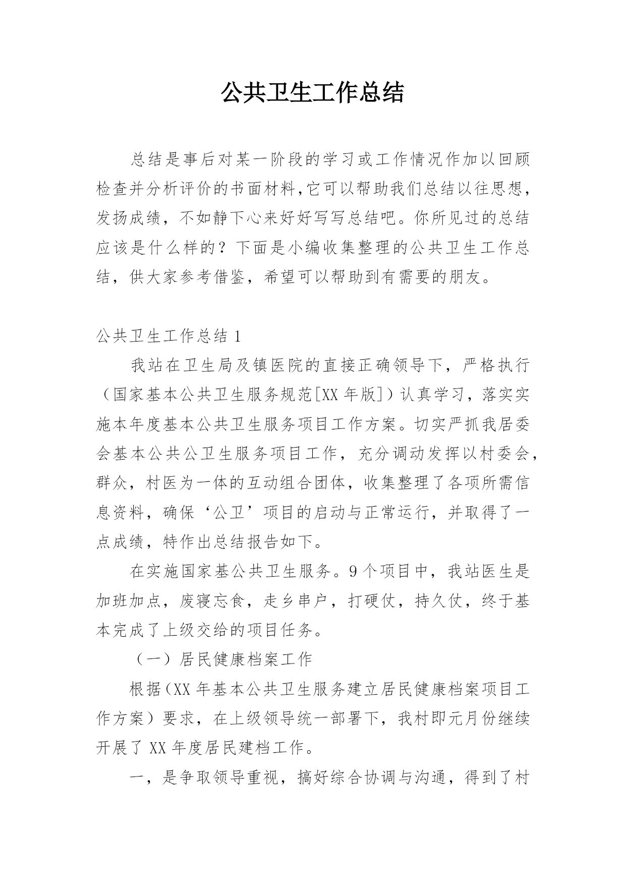 公共卫生工作总结总结是事后对某一阶段的学习或工作情况作加以回顾检查并分析评价的书面材料,它可以帮助我们总结以往思想,发扬成绩,不如静下心来好好写写总结吧。你所见过的总结应该是什么样的?下面是小编收集整理的公共卫生工作总结,供大家参考借鉴,希望可以帮助到有需要的朋友。公共卫生工作总结1我站在卫生局及镇医院的直接正确领导下,严格执行(国家基本公共卫生服务规范[XX年版])认真学习,落实实施本年度基本公共卫生服务项目工作方案。切实严抓我居委会基本公共公卫生服务项目工作,充分调动发挥以村委会,群众,村医为一体的互