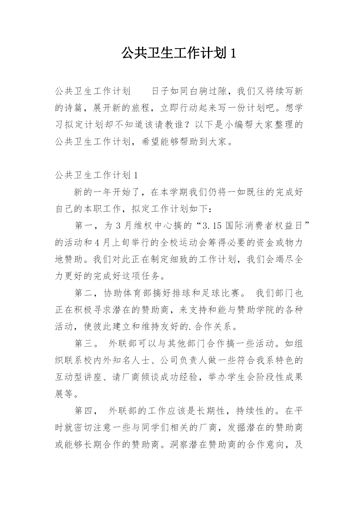 公共卫生工作计划1公共卫生工作计划日子如同白驹过隙,我们又将续写新的诗篇,展开新的旅程,立即行动起来写一份计划吧。想学习拟定计划却不知道该请教谁?以下是小编帮大家整理的公共卫生工作计划,希望能够帮助到大家。公共卫生工作计划1新的一年开始了,在本学期我们仍将一如既往的完成好自己的本职工作,拟定工作计划如下:第一,为3月维权中心搞的“3.15国际消费者权益日”的活动和4月上旬举行的全校运动会筹得必要的资金或物力地赞助。我们对此正在制定细致的工作计划,我们会竭尽全力更好的完成好这项任务。第二,协助体育部搞好排球