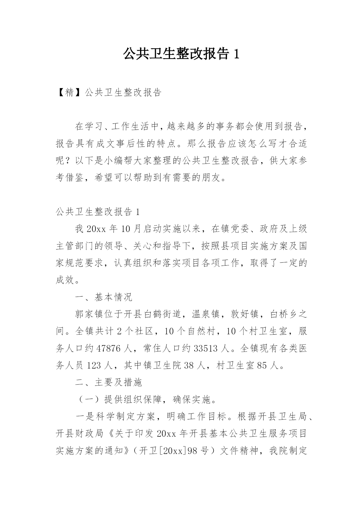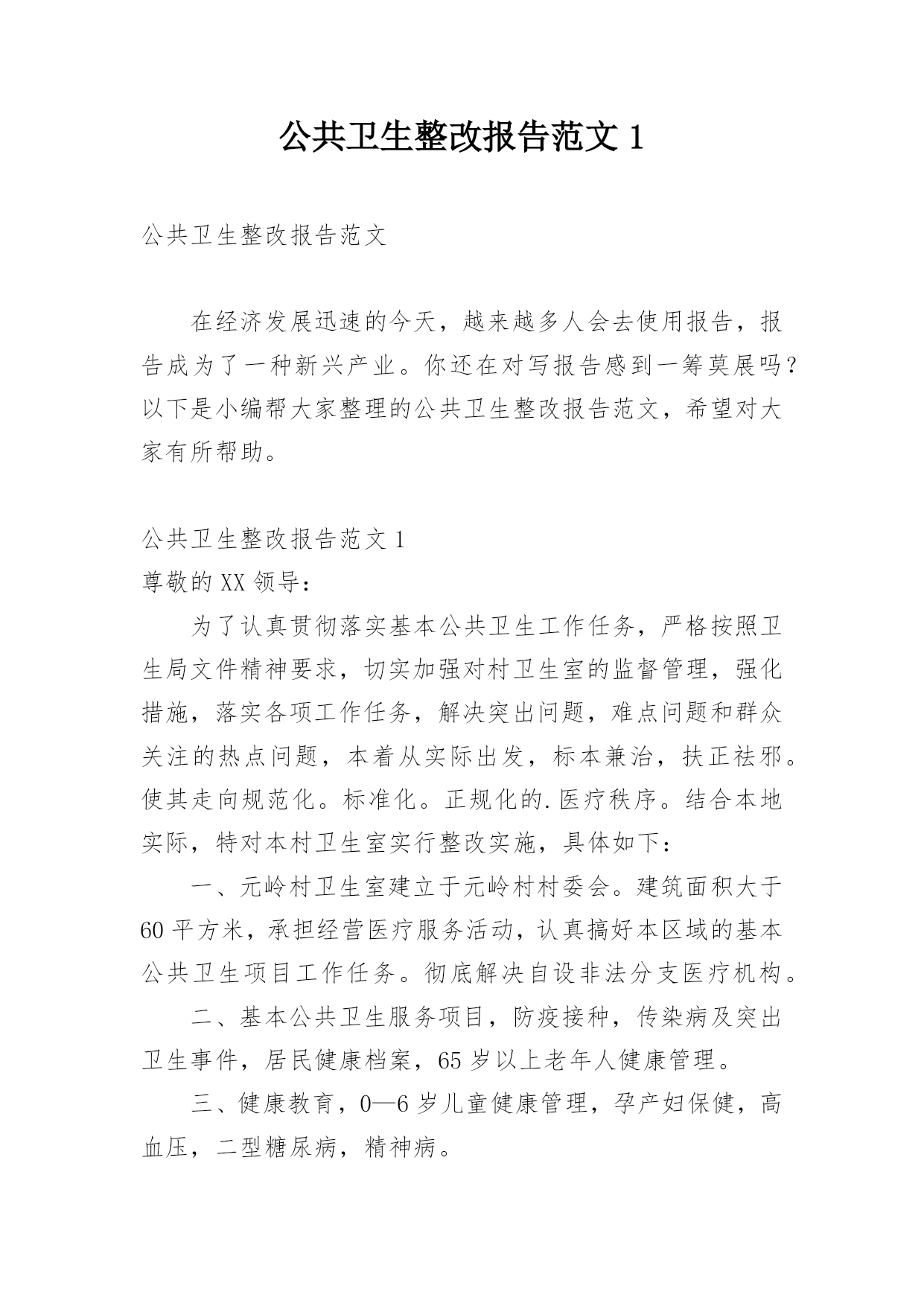 公共卫生整改报告范文1公共卫生整改报告范文在经济发展迅速的今天,越来越多人会去使用报告,报告成为了一种新兴产业。你还在对写报告感到一筹莫展吗?以下是小编帮大家整理的公共卫生整改报告范文,希望对大家有所帮助。公共卫生整改报告范文1尊敬的XX领导:为了认真贯彻落实基本公共卫生工作任务,严格按照卫生局文件精神要求,切实加强对村卫生室的监督管理,强化措施,落实各项工作任务,解决突出问题,难点问题和群众关注的热点问题,本着从实际出发,标本兼治,扶正祛邪。使其走向规范化。标准化。正规化的.医疗秩序。结合本地实际,特对