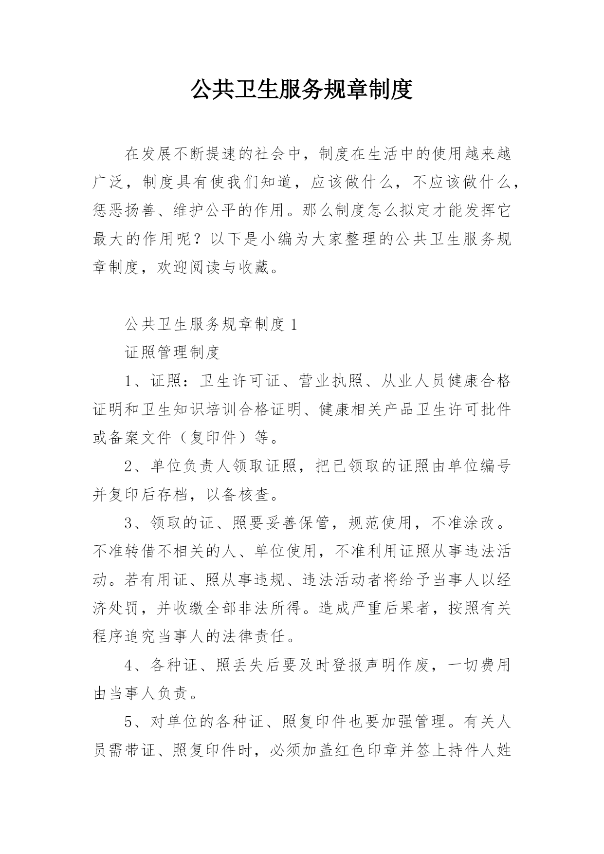 公共卫生服务规章制度在发展不断提速的社会中,制度在生活中的使用越来越广泛,制度具有使我们知道,应该做什么,不应该做什么,惩恶扬善、维护公平的作用。那么制度怎么拟定才能发挥它最大的作用呢?以下是小编为大家整理的公共卫生服务规章制度,欢迎阅读与收藏。公共卫生服务规章制度1证照管理制度1、证照:卫生许可证、营业执照、从业人员健康合格证明和卫生知识培训合格证明、健康相关产品卫生许可批件或备案文件(复印件)等。2、单位负责人领取证照,把已领取的证照由单位编号并复印后存档,以备核查。3、领取的证、照要妥善保管,规范使