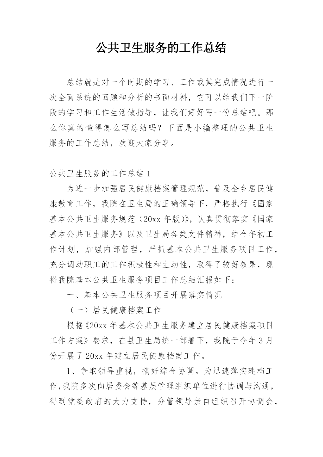 公共卫生服务的工作总结总结就是对一个时期的学习、工作或其完成情况进行一次全面系统的回顾和分析的书面材料,它可以给我们下一阶段的学习和工作生活做指导,让我们好好写一份总结吧。那么你真的懂得怎么写总结吗?下面是小编整理的公共卫生服务的工作总结,欢迎大家分享。公共卫生服务的工作总结1为进一步加强居民健康档案管理规范,普及全乡居民健康教育工作,我院在卫生局的正确领导下,严格执行《国家基本公共卫生服务规范(20xx年版)》,认真贯彻落实《国家基本公共卫生服务》以及卫生局各类文件精神,结合年初工作计划,加强内部管理,