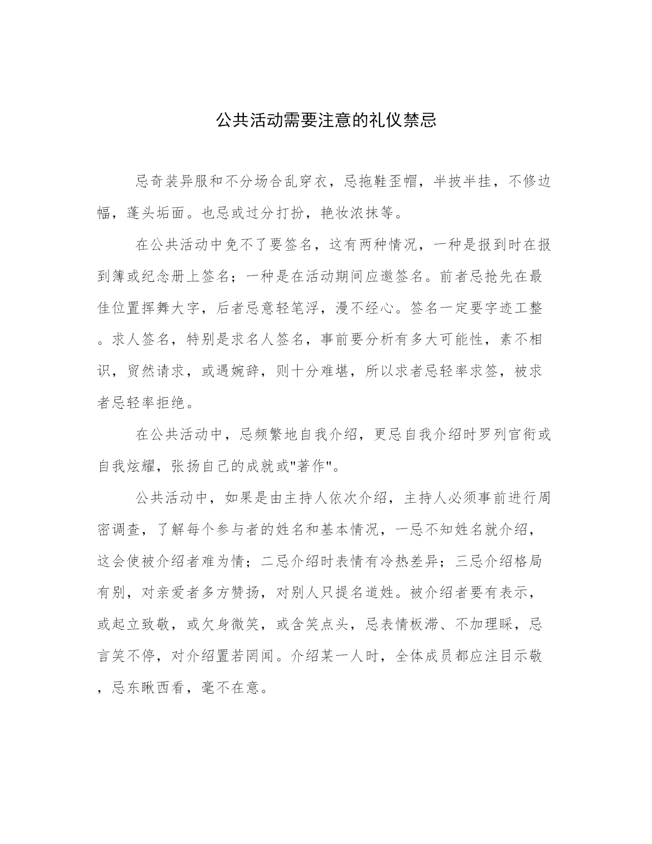 公共活动需要注意的礼仪禁忌忌奇装异服和不分场合乱穿衣,忌拖鞋歪帽,半披半挂,不修边幅,蓬头垢面。也忌或过分打扮,艳妆浓抹等。在公共活动中免不了要签名,这有两种情况,一种是报到时在报到簿或纪念册上签名;一种是在活动期间应邀签名。前者忌抢先在最佳位置挥舞大字,后者忌意轻笔浮,漫不经心。签名一定要字迹工整。求人签名,特别是求名人签名,事前要分析有多大可能性,素不相识,贸然请求,或遇婉辞,则十分难堪,所以求者忌轻率求签,被求者忌轻率拒绝。在公共活动中,忌频繁地自我介绍,更忌自我介绍时罗列官衔或自我炫耀,张扬自己的