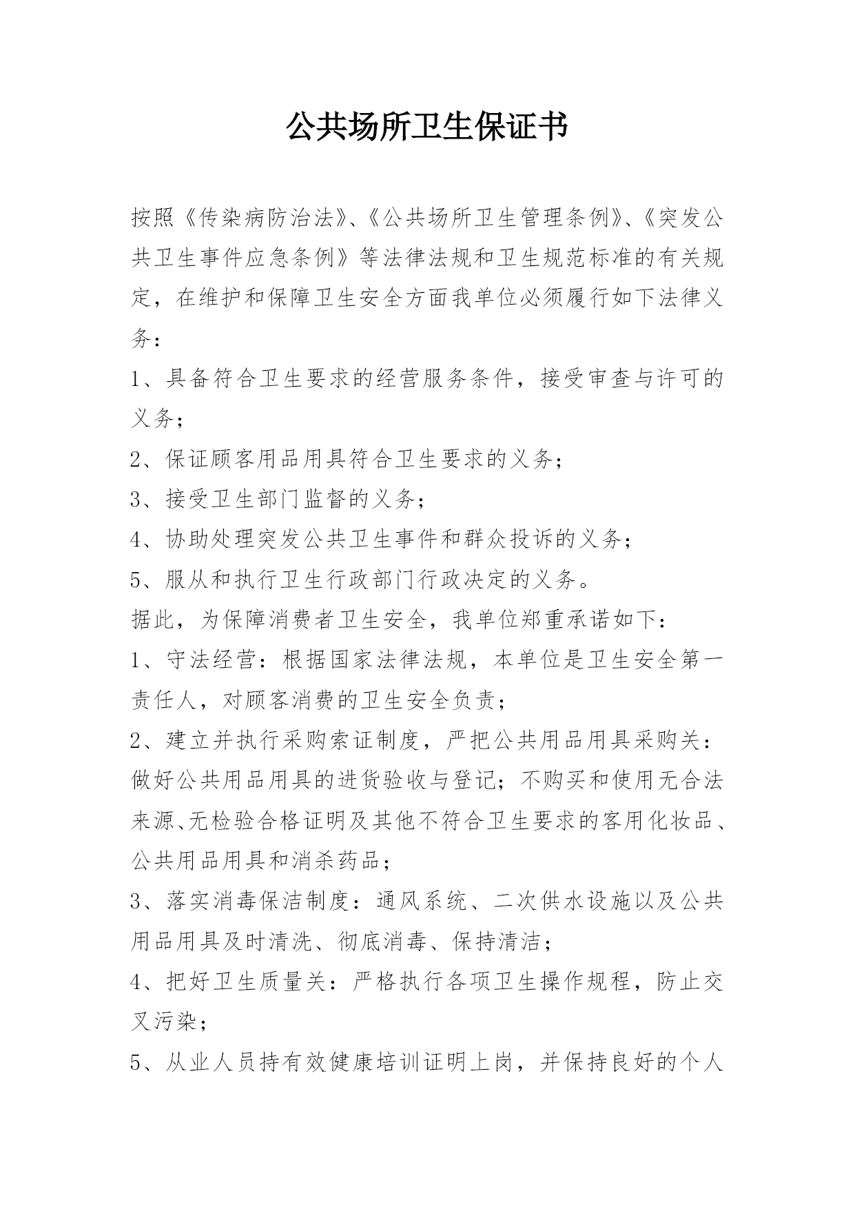 公共场所卫生保证书按照《传染病防治法》、《公共场所卫生管理条例》、《突发公共卫生事件应急条例》等法律法规和卫生规范标准的有关规定,在维护和保障卫生安全方面我单位必须履行如下法律义务:1、具备符合卫生要求的经营服务条件,接受审查与许可的义务;2、保证顾客用品用具符合卫生要求的义务;3、接受卫生部门监督的义务;4、协助处理突发公共卫生事件和群众投诉的义务;5、服从和执行卫生行政部门行政决定的义务。据此,为保障消费者卫生安全,我单位郑重承诺如下:1、守法经营:根据国家法律法规,本单位是卫生安全第一责任人,对顾客