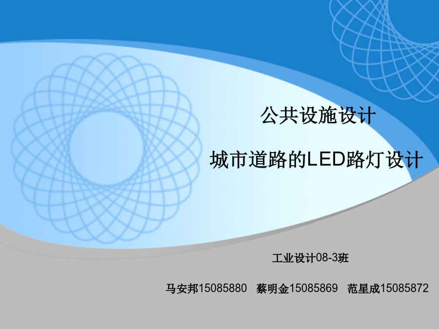 工业设计08-3班马安邦15085880蔡明金15085869范星成15085872城市道路的LED路灯设计课题概述开发新型高效、节能、寿命长、显色指数高、环保的LED路灯对城市照明节能具有十分重要的意义。设计定位:设计符合城市文化和自环境的LED路灯。注意要点:太阳能路灯使用LED是不是最佳的光源?LED分好几种,都有哪些?优势和弊端都有哪些?如何区分?谁家的更好?其LED的有效发光流明是多少?公共设施设计城市道路LED路灯设计