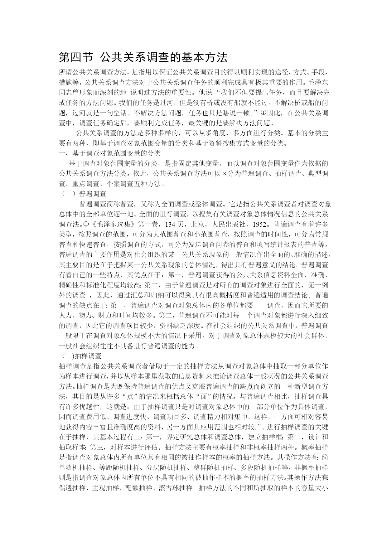 公共关系调查的基本方法所谓公共关系调查方法,是指用以保证公共关系调查目的得以顺利实现的途径、方式、手段、措施等。公共关系调查方法对于公共关系调查任务的顺利完成具有极其重要的作用。毛泽东同志曾形象而深刻的地说明过方法的重要性。他说:“我们不但要提出任务,而且要解决完成任务的方法问题。我们的任务是过河,但是没有桥或没有船就不能过。不解决桥或船的问题,过河就是一句空话。不解决方法问题,任务也只是瞎说一顿。”EQ\o\ac(○,1)因此,在公共关系调查中,调查任务确定后,要顺利完成任务,最关键的是要解决方法