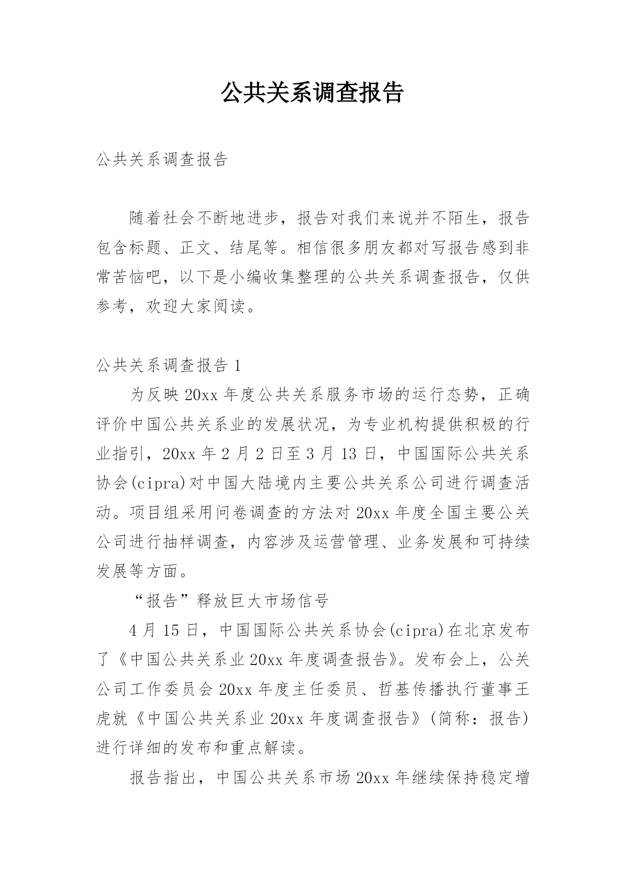 公共关系调查报告公共关系调查报告随着社会不断地进步,报告对我们来说并不陌生,报告包含标题、正文、结尾等。相信很多朋友都对写报告感到非常苦恼吧,以下是小编收集整理的公共关系调查报告,仅供参考,欢迎大家阅读。公共关系调查报告1为反映20xx年度公共关系服务市场的运行态势,正确评价中国公共关系业的发展状况,为专业机构提供积极的行业指引,20xx年2月2日至3月13日,中国国际公共关系协会(cipra)对中国大陆境内主要公共关系公司进行调查活动。项目组采用问卷调查的方法对20xx年度全国主要公关公司进行抽样调查,