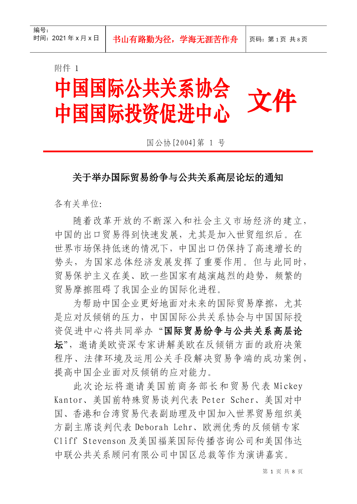 编号:时间:2021年x月x日书山有路勤为径,学海无涯苦作舟页码:第PAGE8页共NUMPAGES8页第PAGE\*MERGEFORMAT8页共NUMPAGES\*MERGEFORMAT8页附件1文件中国国际公共关系协会中国国际投资促进中心国公协[2004]第1号关于举办国际贸易纷争与公共关系高层论坛的通知各有关单位:随着改革开放的不断深入和社会主义市场经济的建立,中国的出口贸易得到快速发展,尤其是加入世贸组织后。在世界市场保持低迷的情况下,中国出口仍保持了高速增长的势头,为国家总