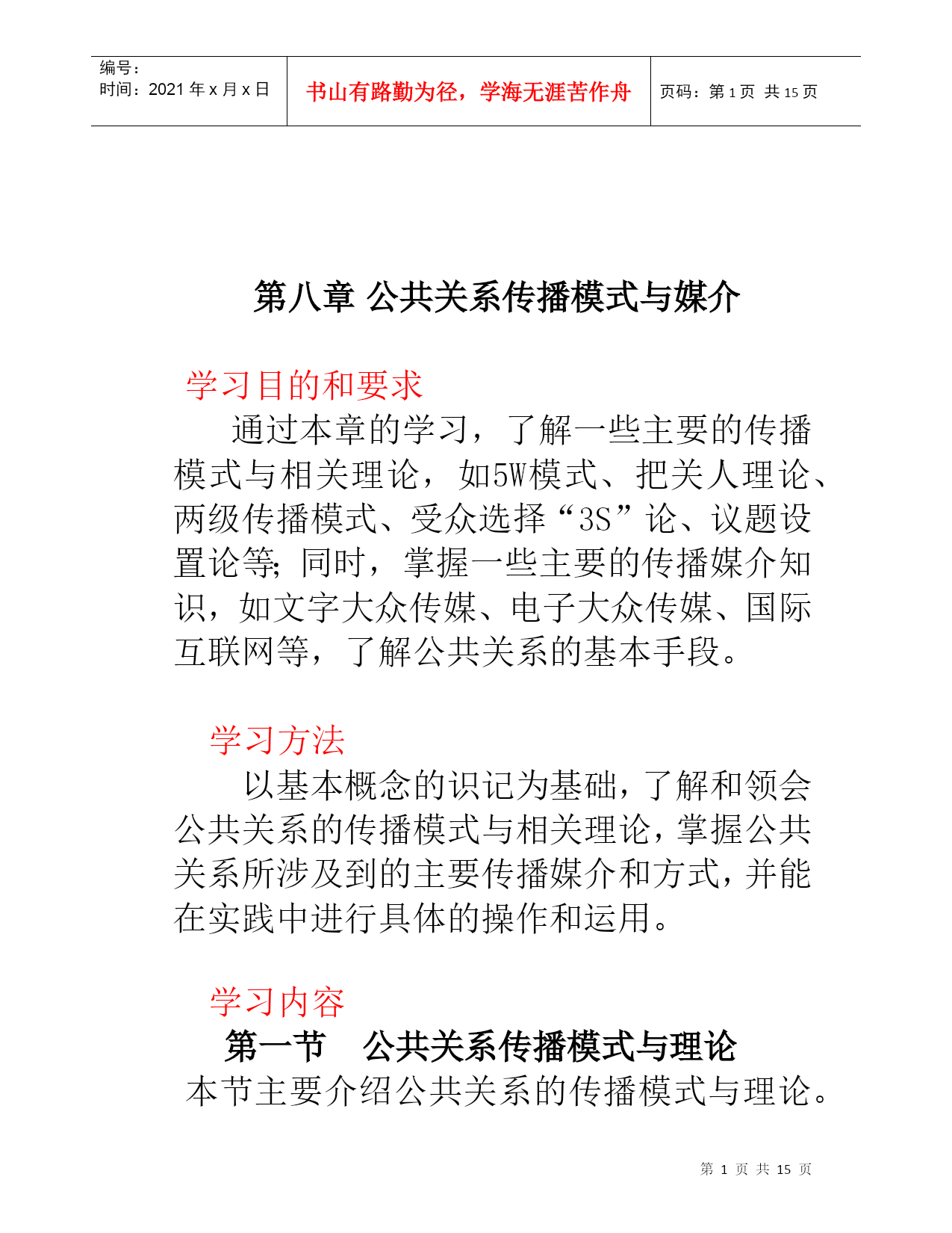 编号:时间:2021年x月x日书山有路勤为径,学海无涯苦作舟页码:第PAGE15页共NUMPAGES15页第PAGE\*MERGEFORMAT15页共NUMPAGES\*MERGEFORMAT15页HYPERLINK"xxxx/"公共关系传播模式与媒介学习目的和要求通过本章的学习,了解一些主要的传播模式与相关理论,如5W模式、把关人理论、两级传播模式、受众选择“3S”论、议题设置论等;同时,掌握一些主要的传播媒介知识,如文字大众传媒、电子大众传媒、国际互联网等,了解公共关系的
