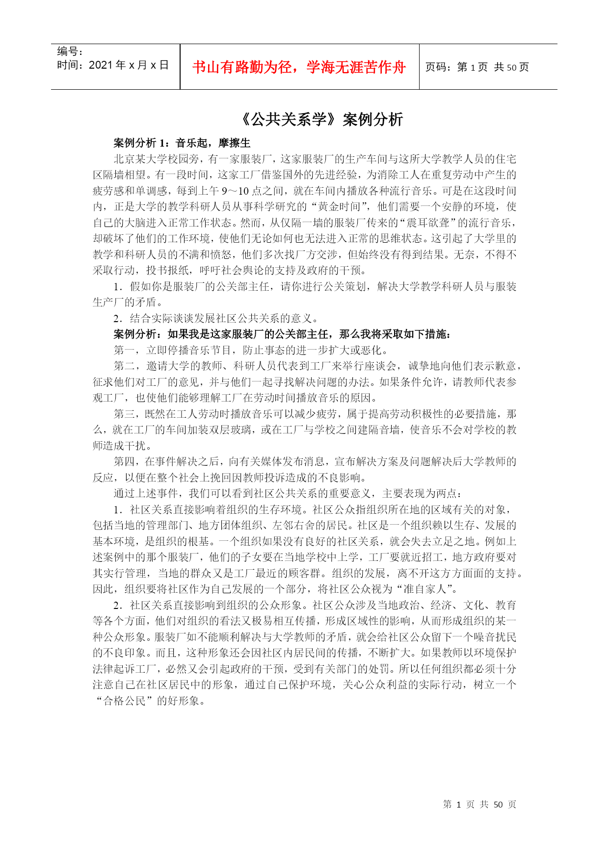 编号:时间:2021年x月x日书山有路勤为径,学海无涯苦作舟页码:第PAGE50页共NUMPAGES50页第PAGE\*MERGEFORMAT50页共NUMPAGES\*MERGEFORMAT50页《公共关系学》案例分析案例分析1:音乐起,摩擦生北京某大学校园旁,有一家服装厂,这家服装厂的生产车间与这所大学教学人员的住宅区隔墙相望。有一段时间,这家工厂借鉴国外的先进经验,为消除工人在重复劳动中产生的疲劳感和单调感,每到上午9~10点之间,就在车间内播放各种流行音乐。可是在这段时间内