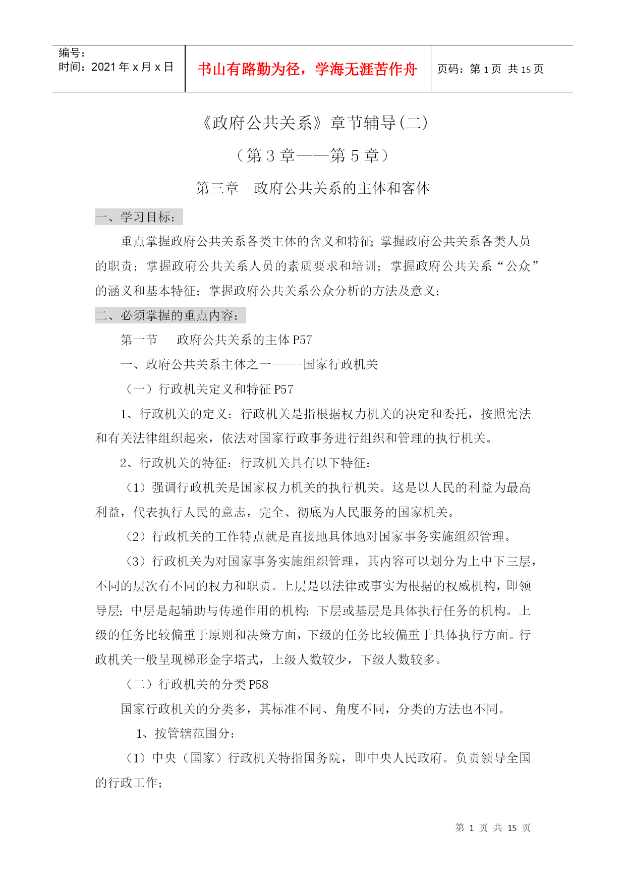 编号:时间:2021年x月x日书山有路勤为径,学海无涯苦作舟页码:第PAGE15页共NUMPAGES15页第PAGE\*MERGEFORMAT15页共NUMPAGES\*MERGEFORMAT15页《政府公共关系》章节辅导(二)(第3章——第5章)第三章政府公共关系的主体和客体一、学习目标:重点掌握政府公共关系各类主体的含义和特征;掌握政府公共关系各类人员的职责;掌握政府公共关系人员的素质要求和培训;掌握政府公共关系“公众”的涵义和基本特征;掌握政府公共关系公众分析的方法及意义;二