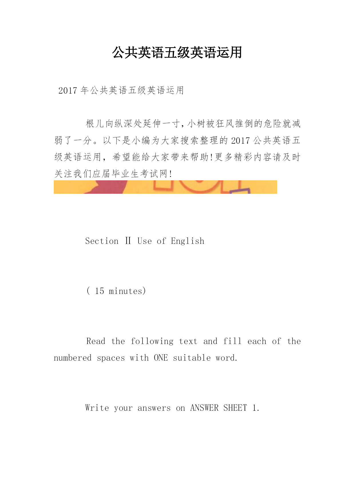 公共英语五级英语运用2017年公共英语五级英语运用根儿向纵深处延伸一寸,小树被狂风推倒的危险就减弱了一分。以下是小编为大家搜索整理的2017公共英语五级英语运用,希望能给大家带来帮助!更多精彩内容请及时关注我们应届毕业生考试网!SectionⅡUseofEnglish(15minutes)ReadthefollowingtextandfilleachofthenumberedspaceswithONEsuitableword.WriteyouranswersonANSWERSHEET1."The