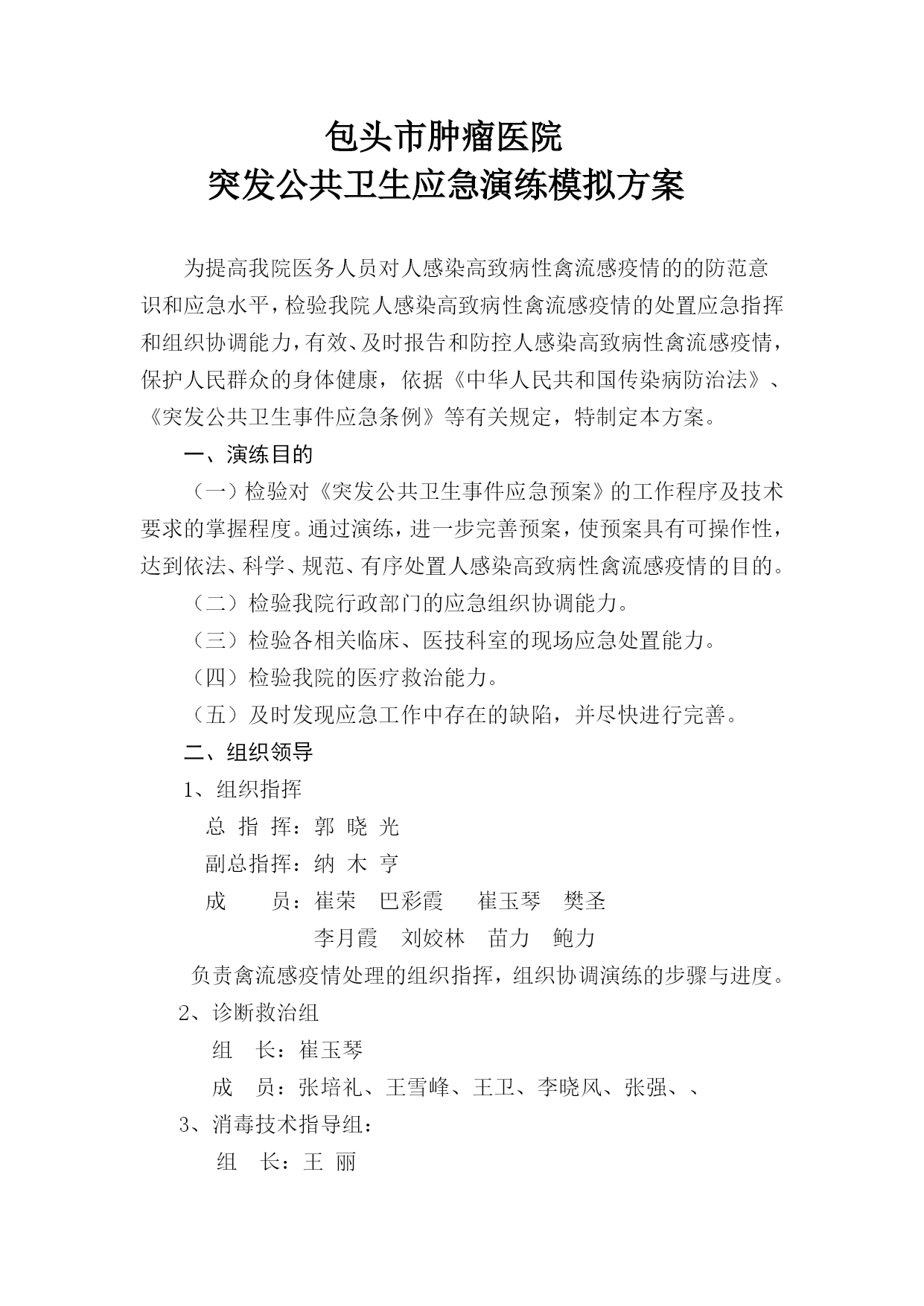 包头市肿瘤医院突发公共卫生应急演练模拟方案为提高我院医务人员对人感染高致病性禽流感疫情的的防范意识和应急水平,检验我院人感染高致病性禽流感疫情的处置应急指挥和组织协调能力,有效、及时报告和防控人感染高致病性禽流感疫情,保护人民群众的身体健康,依据《中华人民共和国传染病防治法》、《突发公共卫生事件应急条例》等有关规定,特制定本方案。一、演练目的(一)检验对《突发公共卫生事件应急预案》的工作程序及技术要求的掌握程度。通过演练,进一步完善预案,使预案具有可操作性,达到依法、科学、规范、有序处置人感染高致病性禽流