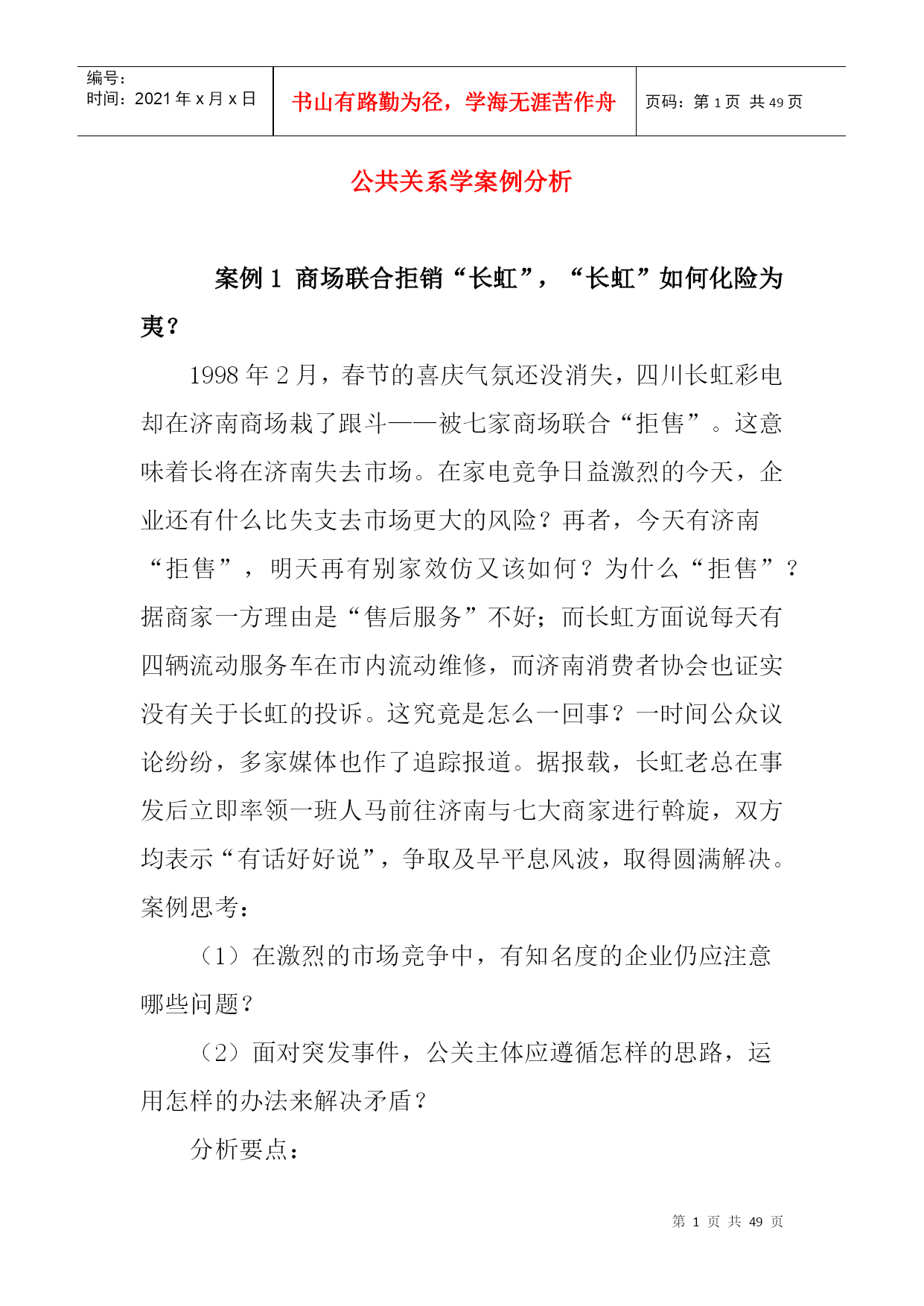 编号:时间:2021年x月x日书山有路勤为径,学海无涯苦作舟页码:第PAGE49页共NUMPAGES49页第PAGE\*MERGEFORMAT49页共NUMPAGES\*MERGEFORMAT49页公共关系学案例分析案例1商场联合拒销“长虹”,“长虹”如何化险为夷?1998年2月,春节的喜庆气氛还没消失,四川长虹彩电却在济南商场栽了跟斗——被七家商场联合“拒售”。这意味着长将在济南失去市场。在家电竞争日益激烈的今天,企业还有什么比失支去市场更大的风险?再者,今天有济南“拒售”,明天
