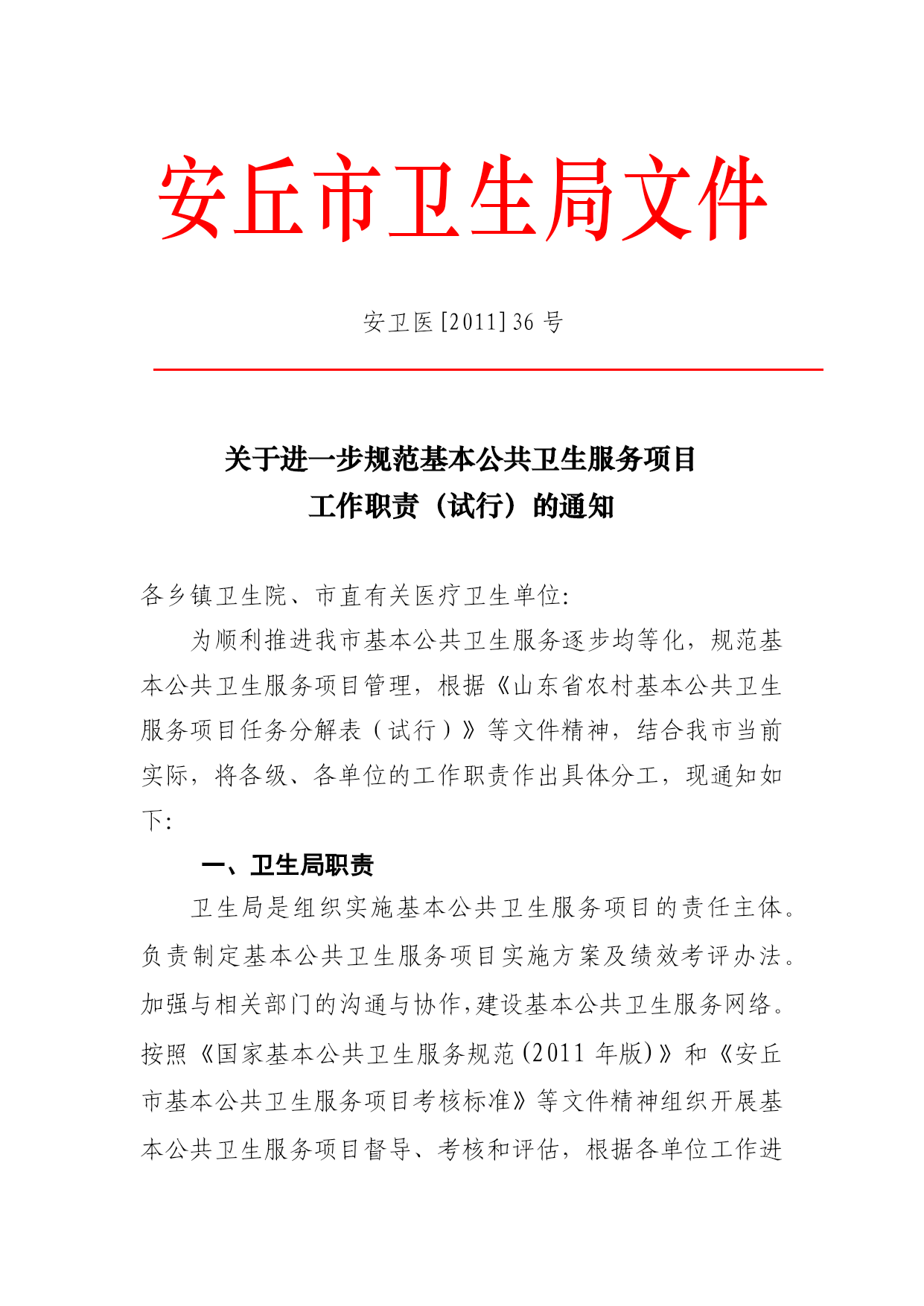 安丘市卫生局文件安卫医[2011]36号关于进一步规范基本公共卫生服务项目工作职责(试行)的通知各乡镇卫生院、市直有关医疗卫生单位:为顺利推进我市基本公共卫生服务逐步均等化,规范基本公共卫生服务项目管理,根据《山东省农村基本公共卫生服务项目任务分解表(试行)》等文件精神,结合我市当前实际,将各级、各单位的工作职责作出具体分工,现通知如下:一、卫生局职责卫生局是组织实施基本公共卫生服务项目的责任主体。负责制定基本公共卫生服务项目实施方案及绩效考评办法。加强与相关部门的沟通与协作,建设基本公共卫生服务网络。按
