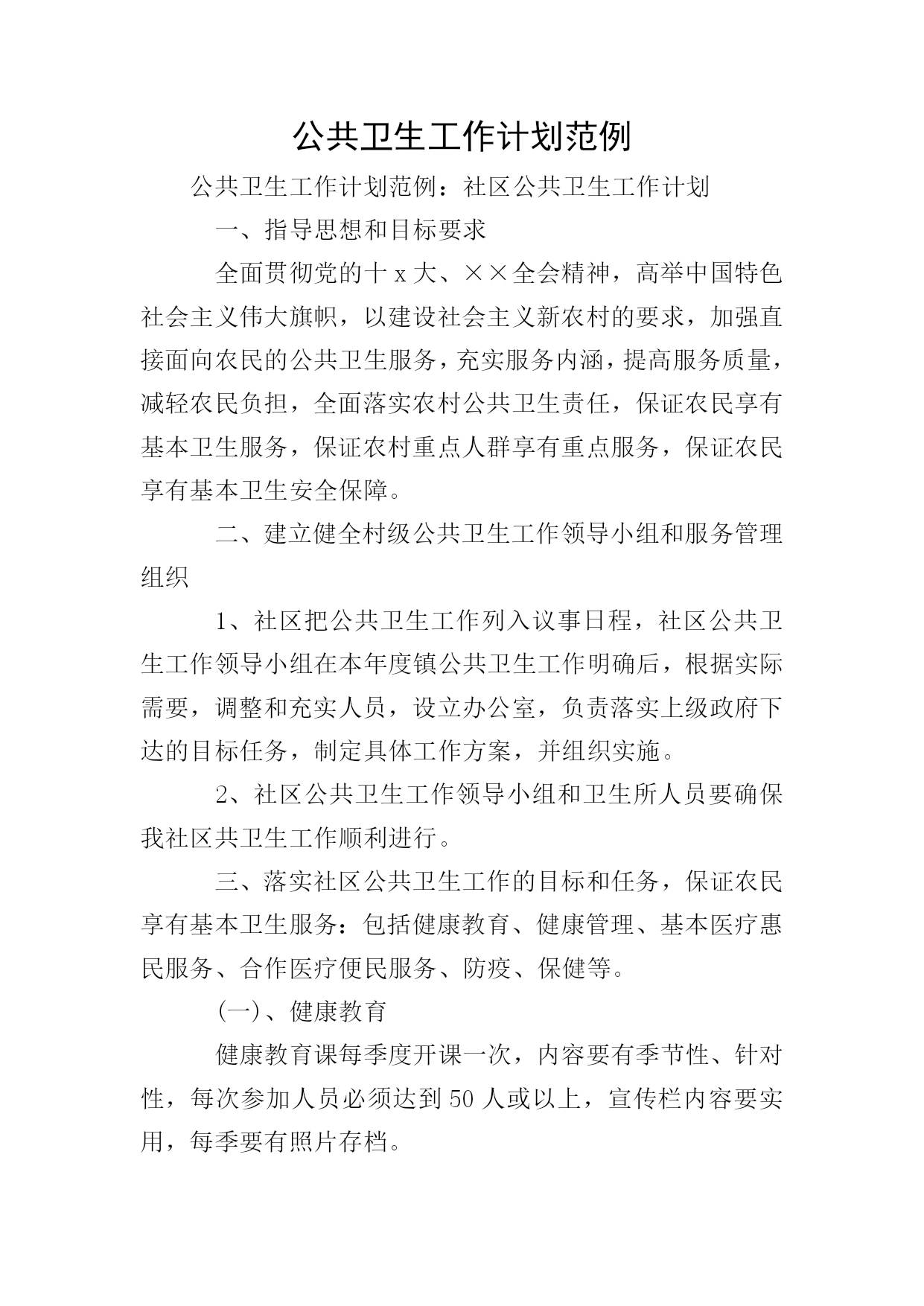 公共卫生工作计划范例公共卫生工作计划范例:社区公共卫生工作计划一、指导思想和目标要求全面贯彻党的十x大、××全会精神,高举中国特色社会主义伟大旗帜,以建设社会主义新农村的要求,加强直接面向农民的公共卫生服务,充实服务内涵,提高服务质量,减轻农民负担,全面落实农村公共卫生责任,保证农民享有基本卫生服务,保证农村重点人群享有重点服务,保证农民享有基本卫生安全保障。二、建立健全村级公共卫生工作领导小组和服务管理组织1、社区把公共卫生工作列入议事日程,社区公共卫生工作领导小组在本年度镇公共卫生工作明确后,根据实际