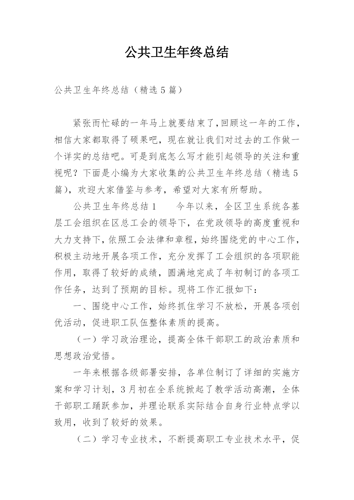 公共卫生年终总结公共卫生年终总结(精选5篇)紧张而忙碌的一年马上就要结束了,回顾这一年的工作,相信大家都取得了硕果吧,现在就让我们对过去的工作做一个详实的总结吧。可是到底怎么写才能引起领导的关注和重视呢?下面是小编为大家收集的公共卫生年终总结(精选5篇),欢迎大家借鉴与参考,希望对大家有所帮助。公共卫生年终总结1今年以来,全区卫生系统各基层工会组织在区总工会的领导下,在党政领导的高度重视和大力支持下,依照工会法律和章程,始终围绕党的中心工作,积极主动地开展各项工作,充分发挥了工会组织的各项职能作用,取得了