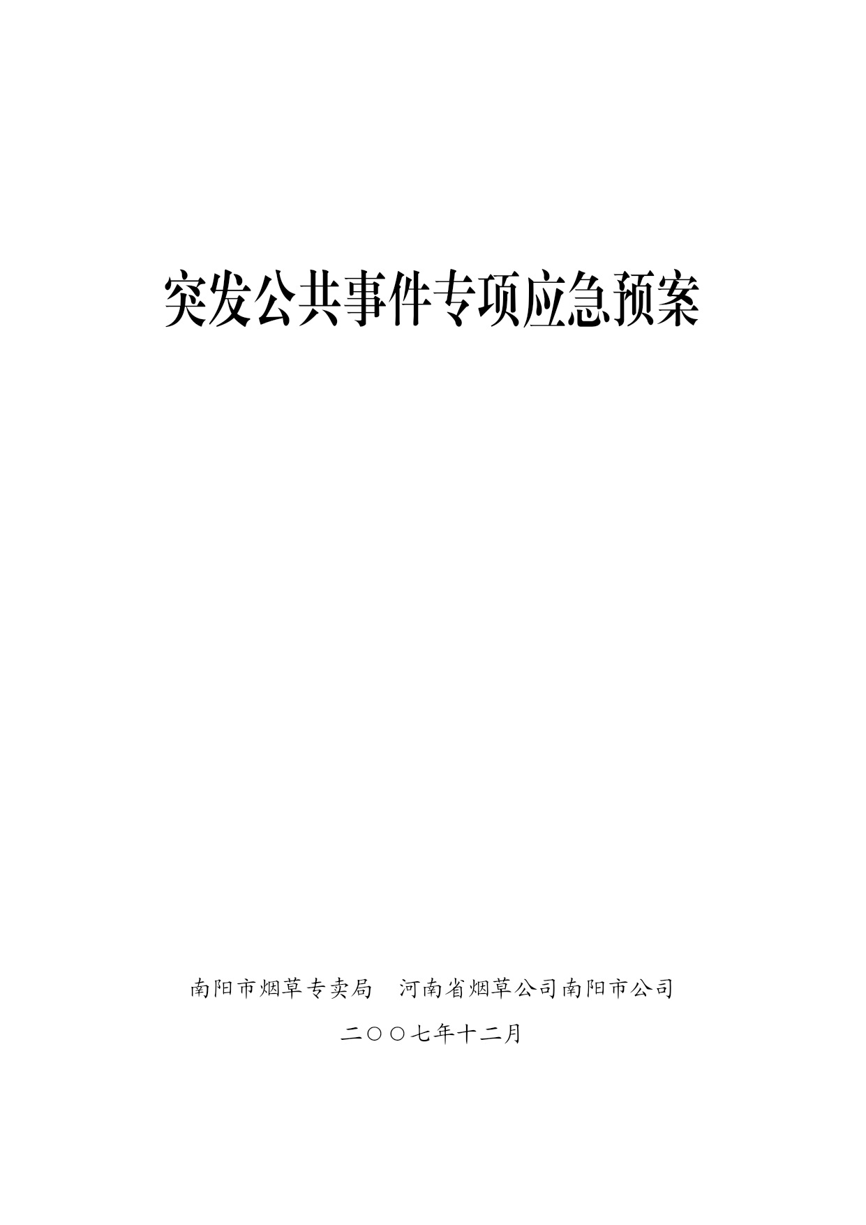 突发公共事件专项应急预案南阳市烟草专卖局河南省烟草公司南阳市公司二○○七年十二月目录1.信息网络事故应急预案2.洪涝灾害事件应急预案3.火灾事故应急预案4.交通事故应急预案5.配电房事故应急预案6.锅炉压力容器爆炸事故应急预案7.电梯事故应急预案8.突发公共卫生事件应急预案9.群体性食物中毒事件应急预案10.暴力抗法事件应急预案11.群体性上访事件应急预案12.南阳市烟草专卖局(公司)突发公共事件应急通讯录信息网络事故应急预案南阳市烟草专卖局河南省烟草公司南阳市公司二○○七年十二月目录TOC\o"1-2