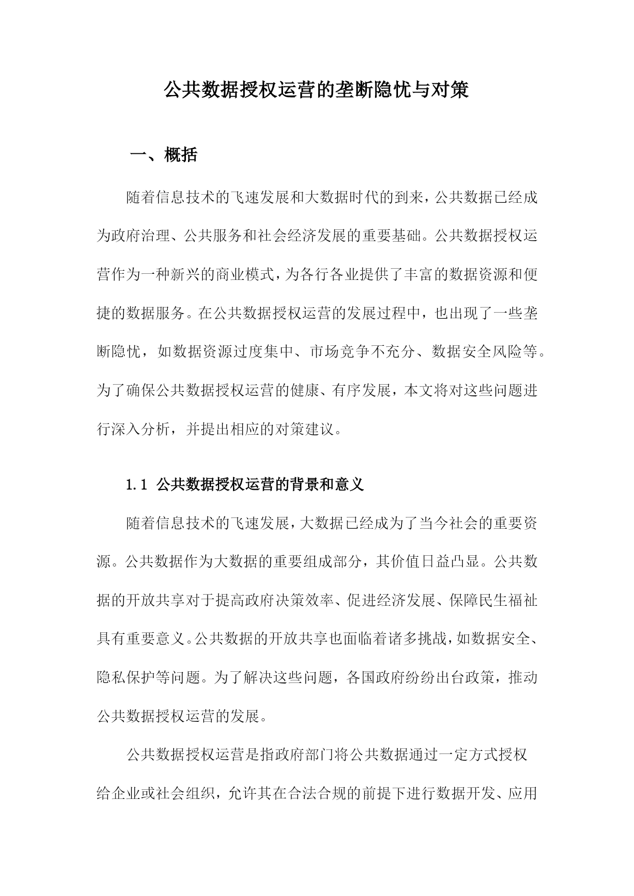 公共数据授权运营的垄断隐忧与对策一、概括随着信息技术的飞速发展和大数据时代的到来,公共数据已经成为政府治理、公共服务和社会经济发展的重要基础。公共数据授权运营作为一种新兴的商业模式,为各行各业提供了丰富的数据资源和便捷的数据服务。在公共数据授权运营的发展过程中,也出现了一些垄断隐忧,如数据资源过度集中、市场竞争不充分、数据安全风险等。为了确保公共数据授权运营的健康、有序发展,本文将对这些问题进行深入分析,并提出相应的对策建议。1.1公共数据授权运营的背景和意义随着信息技术的飞速发展,大数据已经成为了当今社