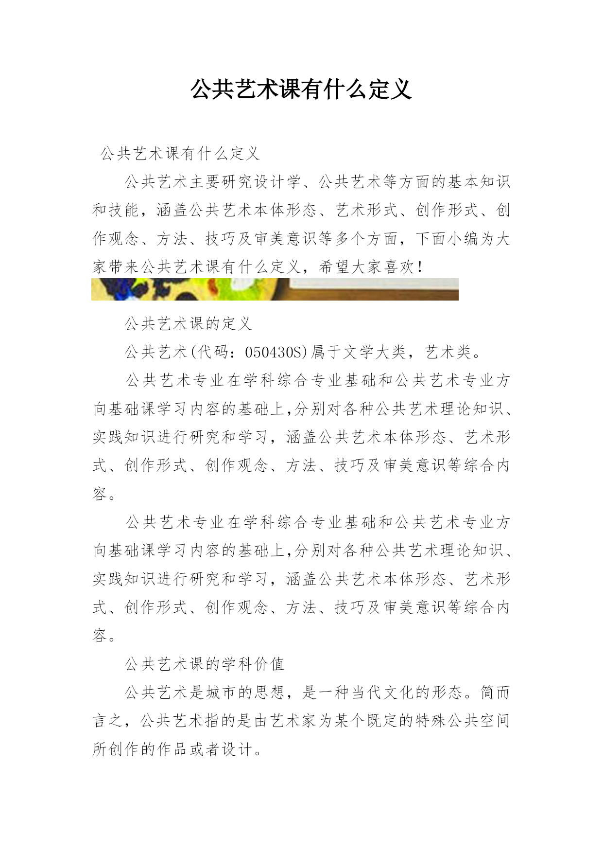 公共艺术课有什么定义公共艺术课有什么定义公共艺术主要研究设计学、公共艺术等方面的基本知识和技能,涵盖公共艺术本体形态、艺术形式、创作形式、创作观念、方法、技巧及审美意识等多个方面,下面小编为大家带来公共艺术课有什么定义,希望大家喜欢!公共艺术课的定义公共艺术(代码:050430S)属于文学大类,艺术类。公共艺术专业在学科综合专业基础和公共艺术专业方向基础课学习内容的基础上,分别对各种公共艺术理论知识、实践知识进行研究和学习,涵盖公共艺术本体形态、艺术形式、创作形式、创作观念、方法、技巧及审美意识等综合内容