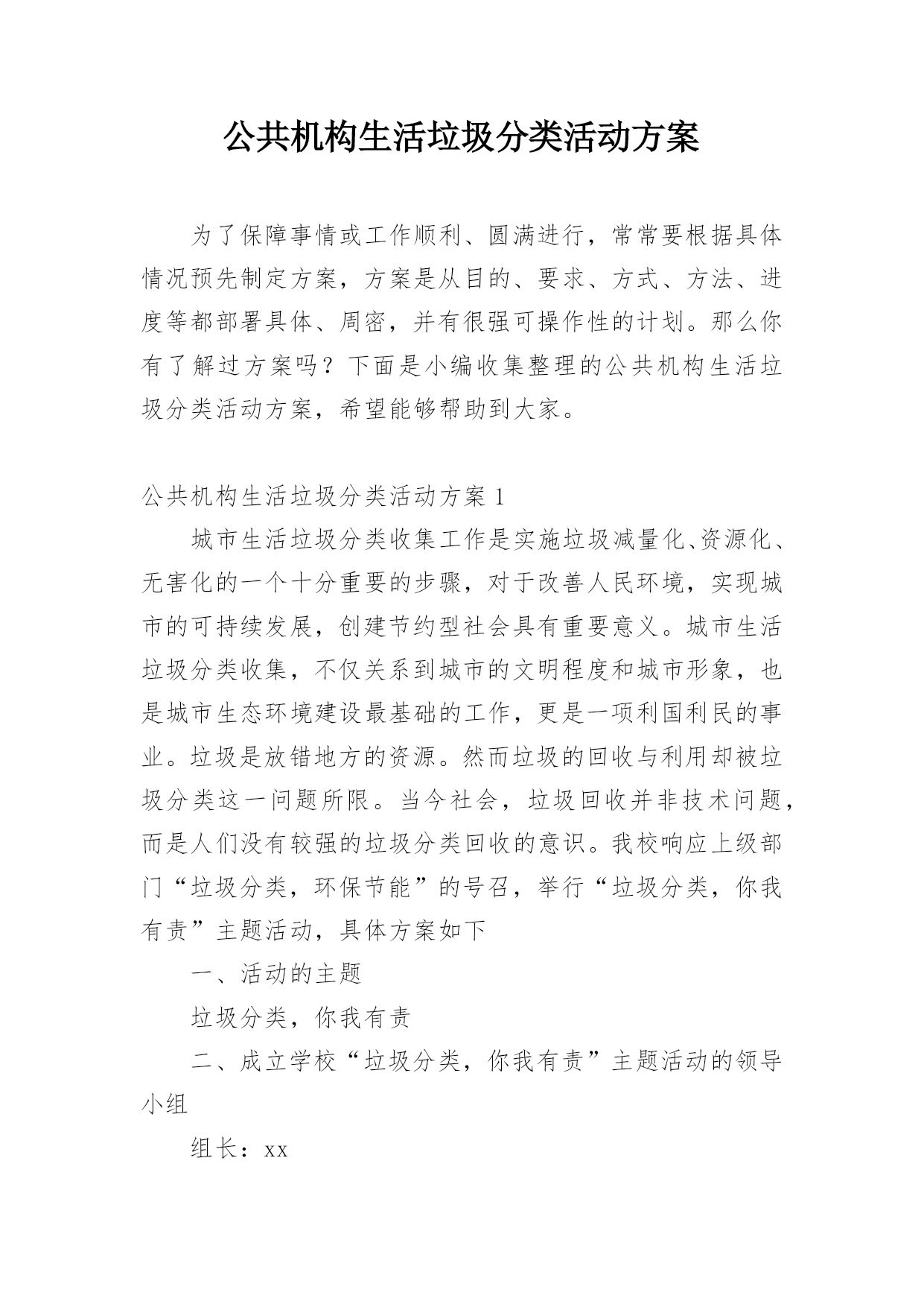 公共机构生活垃圾分类活动方案为了保障事情或工作顺利、圆满进行,常常要根据具体情况预先制定方案,方案是从目的、要求、方式、方法、进度等都部署具体、周密,并有很强可操作性的计划。那么你有了解过方案吗?下面是小编收集整理的公共机构生活垃圾分类活动方案,希望能够帮助到大家。公共机构生活垃圾分类活动方案1城市生活垃圾分类收集工作是实施垃圾减量化、资源化、无害化的一个十分重要的步骤,对于改善人民环境,实现城市的可持续发展,创建节约型社会具有重要意义。城市生活垃圾分类收集,不仅关系到城市的文明程度和城市形象,也是城市生