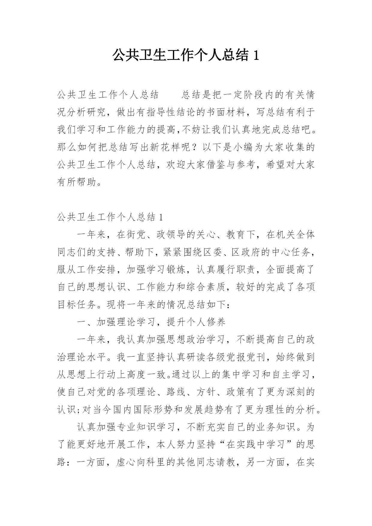 公共卫生工作个人总结1公共卫生工作个人总结总结是把一定阶段内的有关情况分析研究,做出有指导性结论的书面材料,写总结有利于我们学习和工作能力的提高,不妨让我们认真地完成总结吧。那么如何把总结写出新花样呢?以下是小编为大家收集的公共卫生工作个人总结,欢迎大家借鉴与参考,希望对大家有所帮助。公共卫生工作个人总结1一年来,在街党、政领导的关心、教育下,在机关全体同志们的支持、帮助下,紧紧围绕区委、区政府的中心任务,服从工作安排,加强学习锻炼,认真履行职责,全面提高了自己的思想认识、工作能力和综合素质,较好的完成了