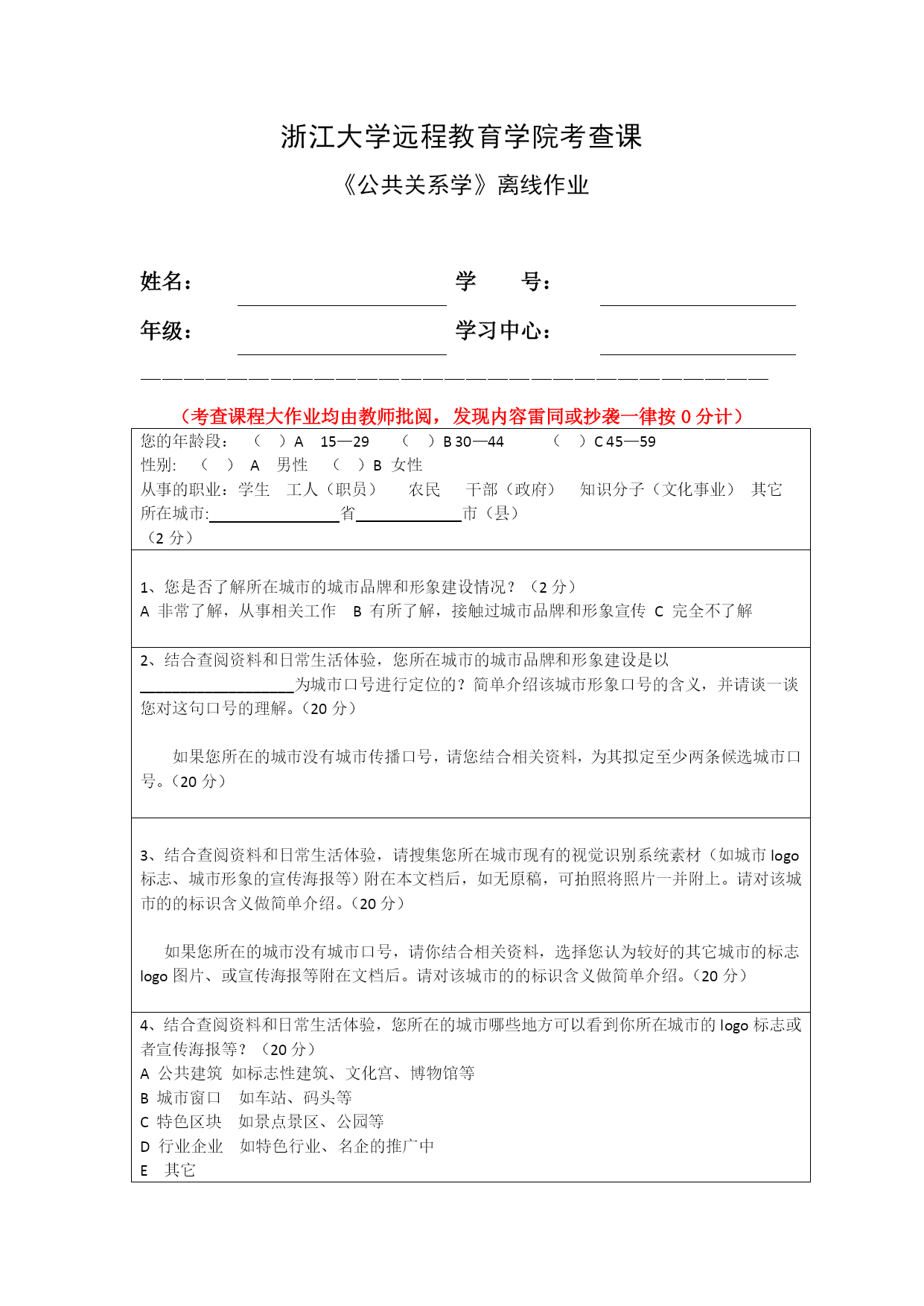 浙江大学远程教育学院考查课《公共关系学》离线作业姓名:学号:年级:学习中心:—————————————————————————————(考查课程大作业均由教师批阅,发现内容雷同或抄袭一律按0分计)您的年龄段:()A15—29()B30—44()C45—59性别:()A男性()B女性从事的职业:学生工人(职员)农民干部(政府)知识分子(文化事业)其它所在城市:省_____市(县)(2分)1、您是否了解所在城市的城市品牌和形象建设情况?(2分)A非常了解,从事相关工作B有所了解,接触过城市品牌和形象宣传C完全