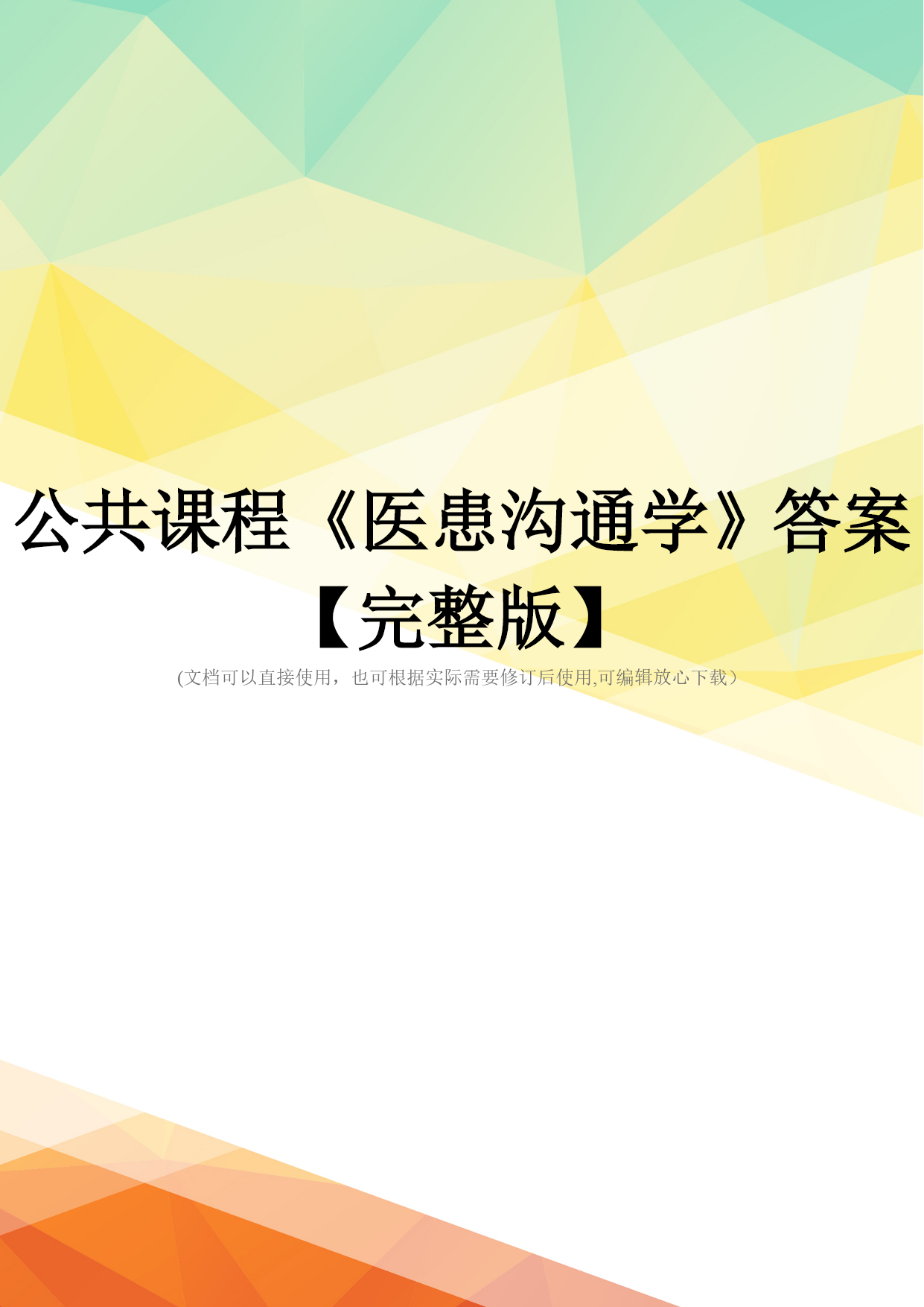公共课程《医患沟通学》答案【完整版】(文档可以直接使用,也可根据实际需要修订后使用,可编辑放心下载)公共课程?医患沟通学?答案“瓜熟蒂落〞说明患者〔〕B“绿色平安通道〞的目标是〔〕B“医〞的含义,狭义上是指〔〕A“医事〞涵盖〔〕等学科体系①医学②药物学③卫生学④管理学A3岁以上年长儿,小儿惊厥的发病原因应主要考虑〔〕D6个月以内的婴儿,小儿惊厥的发病原因应主要考虑〔〕B6个月至3岁的儿童,小儿惊厥的发病原因应主要考虑〔〕C病人谈话中出现沉默的可能性包括〔〕①成心②思维突然中断③冲动④新的意识闪现⑤有难言之