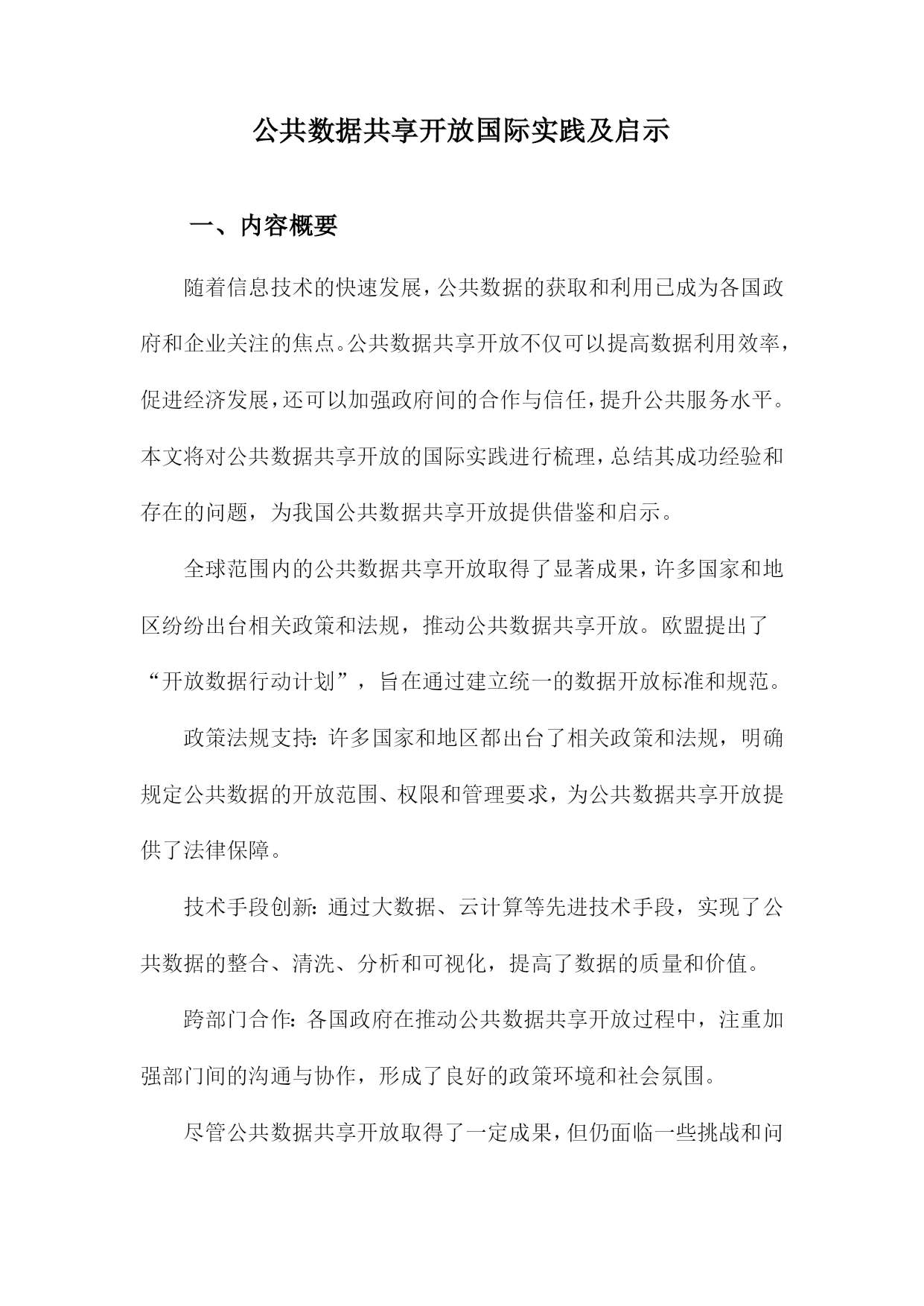 公共数据共享开放国际实践及启示一、内容概要随着信息技术的快速发展,公共数据的获取和利用已成为各国政府和企业关注的焦点。公共数据共享开放不仅可以提高数据利用效率,促进经济发展,还可以加强政府间的合作与信任,提升公共服务水平。本文将对公共数据共享开放的国际实践进行梳理,总结其成功经验和存在的问题,为我国公共数据共享开放提供借鉴和启示。全球范围内的公共数据共享开放取得了显著成果,许多国家和地区纷纷出台相关政策和法规,推动公共数据共享开放。欧盟提出了“开放数据行动计划”,旨在通过建立统一的数据开放标准和规范。政策