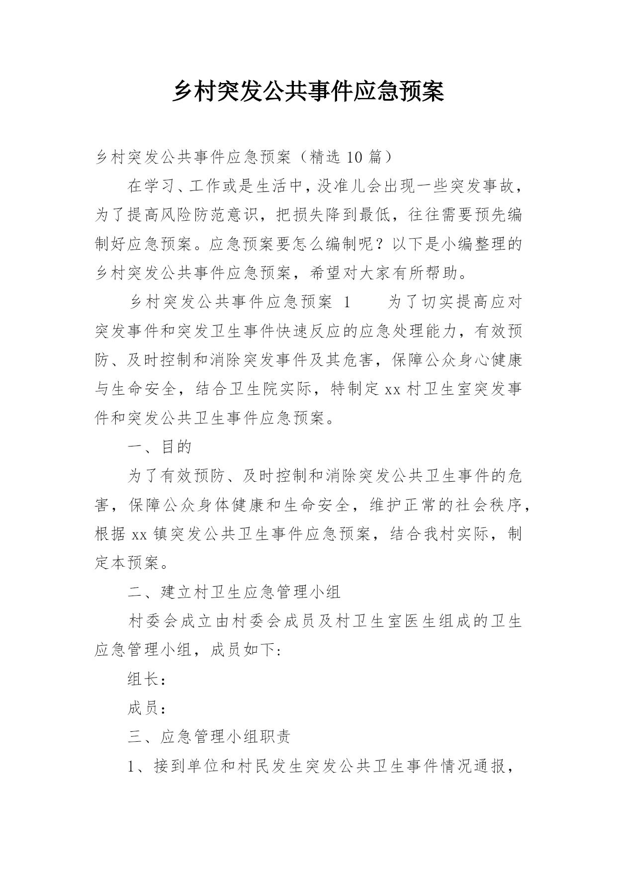 乡村突发公共事件应急预案乡村突发公共事件应急预案(精选10篇)在学习、工作或是生活中,没准儿会出现一些突发事故,为了提高风险防范意识,把损失降到最低,往往需要预先编制好应急预案。应急预案要怎么编制呢?以下是小编整理的乡村突发公共事件应急预案,希望对大家有所帮助。乡村突发公共事件应急预案1为了切实提高应对突发事件和突发卫生事件快速反应的应急处理能力,有效预防、及时控制和消除突发事件及其危害,保障公众身心健康与生命安全,结合卫生院实际,特制定xx村卫生室突发事件和突发公共卫生事件应急预案。一、目的为了有效预防