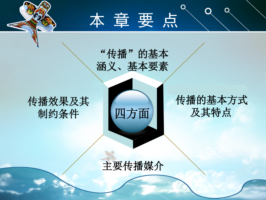 一、传播及其基本要素一、传播及其基本要素一、传播及其基本要素一、传播及其基本要素一、传播及其基本要素人们日常行为的80%以上都与传播有关,传播是人类的一种基本社会行为。公共关系作为一种传播行为,涉及各种不同的传播方式。了解各种基本的传播方式及其特点,有助于我们完整地理解公共关系的传播活动。(一)个体自身的传播又称“个人的自我交流”,即传递信息的主体和接收信息的客体是同一个体;或者说,信息交流的“双方”不是两个人而是同一个人。(二)人际传播沟通“人际传播”指个人与个人之间的信息沟通交往,又称“个人之间的沟通