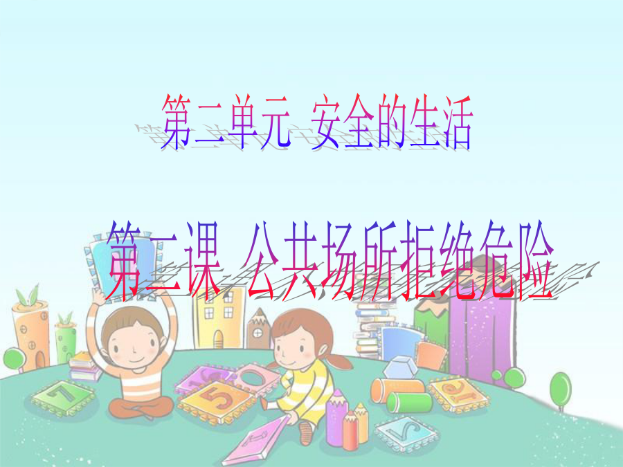 第二单元安全的生活情景讨论1.认识一些公共安全标志、设施的用途,并保护它们。2.安全事故给周围的人带来的伤害及给社会造成影响和损失。3.公共场所要遵守的公共安全规则1.什么是公共场所?2.在我们身边哪些是公共场所公共场所是我们游玩、活动、穿行的公用空间。公共场所中人多物杂,一个小小的无意行为,可能就会引起危险。讨论:1.在公共场所人多的地方踢球行吗?2.这些行为会引起什么样的后果?3.我们可以做些什么?1.认识公共安全标志。2.知道不同的安全标志的作用。讨论:1.在柴草垛旁放鞭炮的行为好吗?2.这样会引起