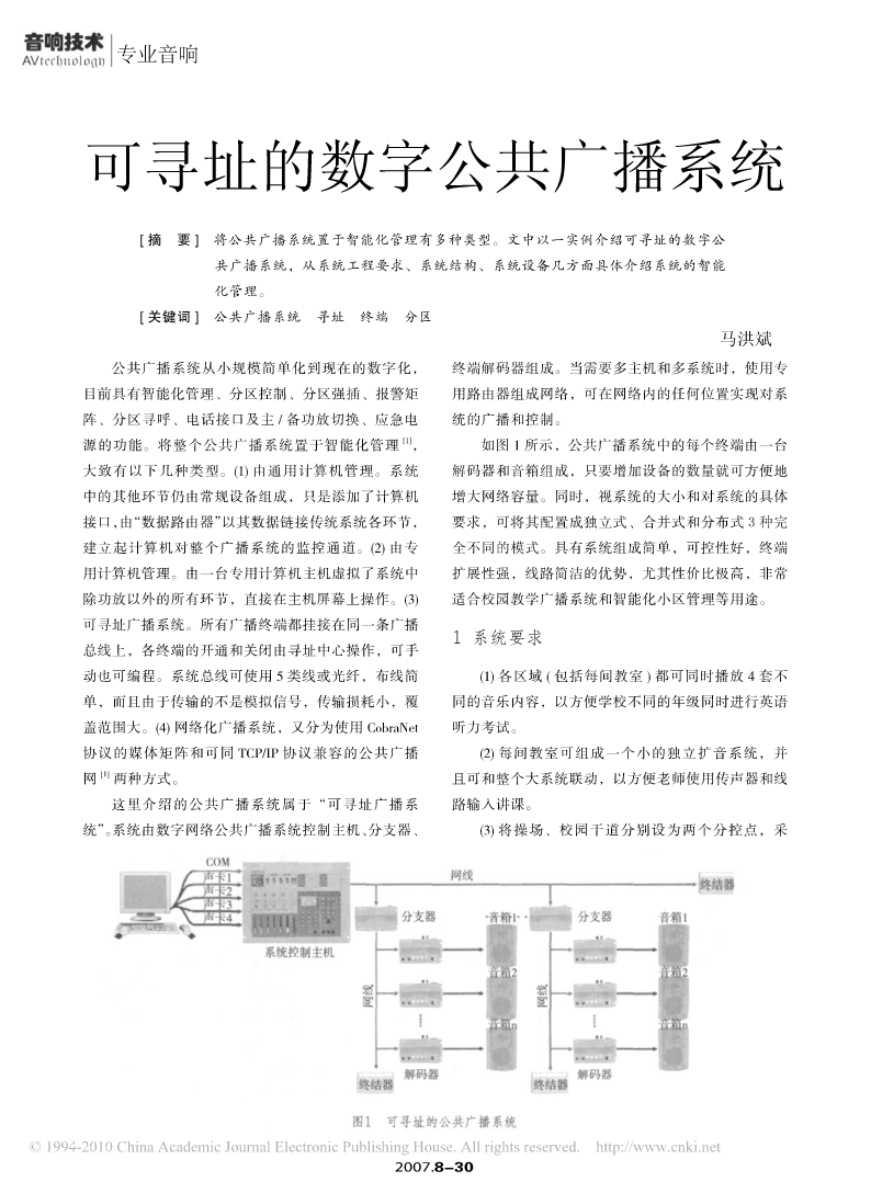 专业音响专业音响可寻址的数字公共广播系统[摘要]将公共广播系统置于智能化管理有多种类型。文中以一实例介绍可寻址的数字公共广播系统,从系统工程要求、系统结构、系统设备几方面具体介绍系统的智能化管理。[关键词]公共广播系统寻址终端分区马洪斌公共广播系统从小规模简单化到现在的数字化,终端解码器组成。当需要多主机和多系统时,使用专目前具有智能化管理、分区控制、分区强插、报警矩用路由器组成网络,可在网络内的任何位置实现对系阵、分区寻呼、电话接口及主/备功放切换、应急电统的广播和控制。源的功能。将整个公共广播系统置于