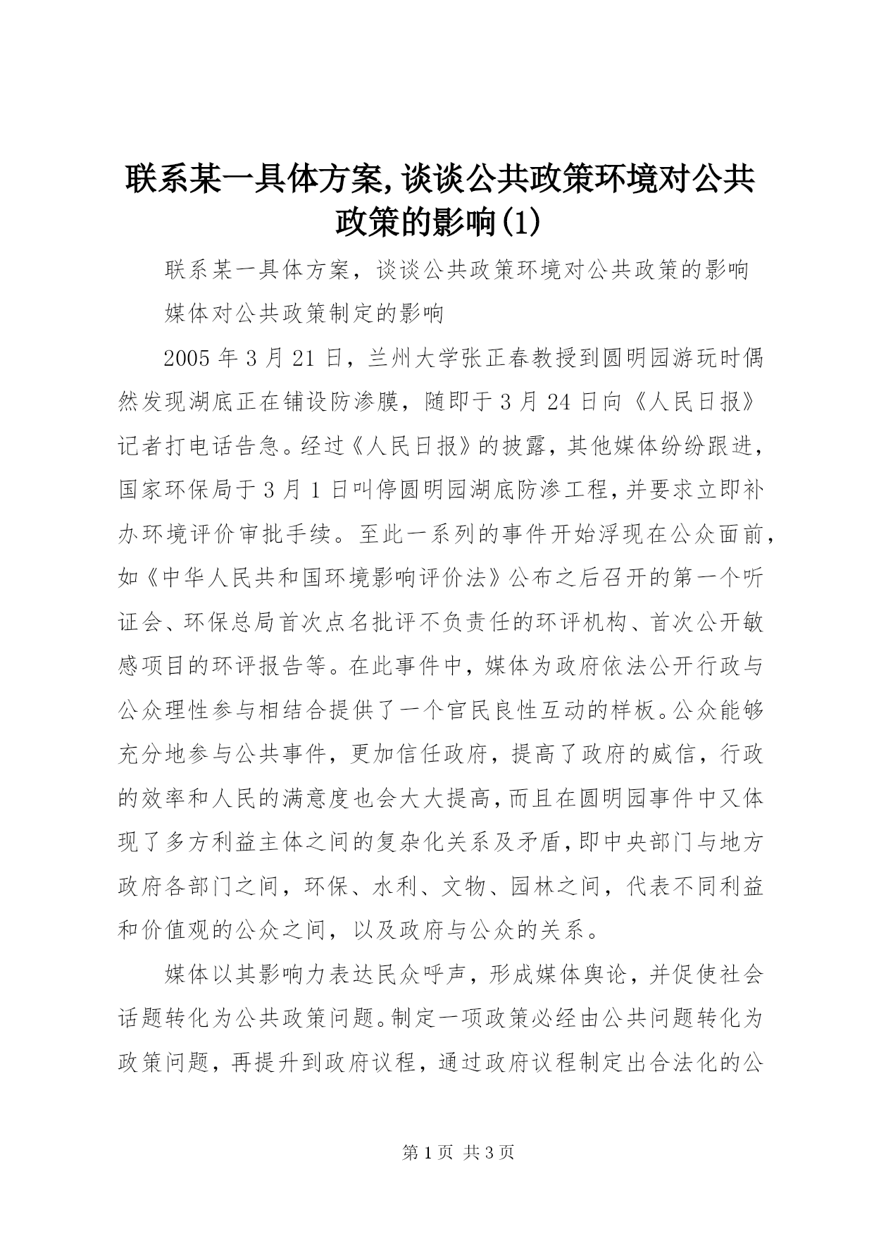 第PAGE\*Arabic\*MERGEFORMAT3页共NUMPAGES\*MERGEFORMAT3页联系某一具体方案,谈谈公共政策环境对公共政策的影响(1)联系某一具体方案,谈谈公共政策环境对公共政策的影响媒体对公共政策制定的影响2005年3月21日,兰州大学张正春教授到圆明园游玩时偶然发现湖底正在铺设防渗膜,随即于3月24日向《人民日报》记者打电话告急。经过《人民日报》的披露,其他媒体纷纷跟进,国家环保局于3月1日叫停圆明园湖底防渗工程,并要求立即补办环境评价审批手续。至此一系列的事件开