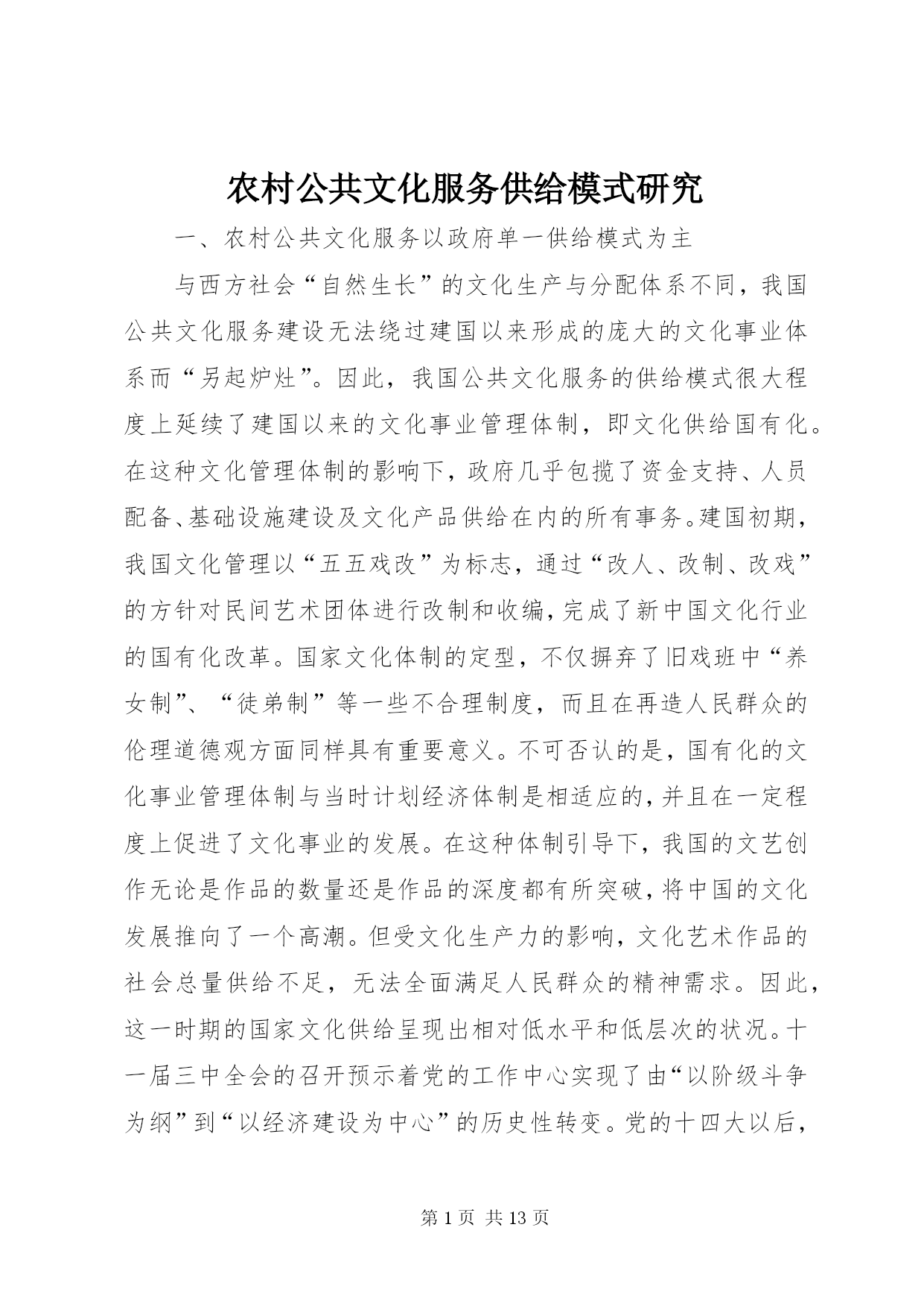 第PAGE\*Arabic\*MERGEFORMAT13页共NUMPAGES\*MERGEFORMAT13页农村公共文化服务供给模式研究一、农村公共文化服务以政府单一供给模式为主与西方社会“自然生长”的文化生产与分配体系不同,我国公共文化服务建设无法绕过建国以来形成的庞大的文化事业体系而“另起炉灶”。因此,我国公共文化服务的供给模式很大程度上延续了建国以来的文化事业管理体制,即文化供给国有化。在这种文化管理体制的影响下,政府几乎包揽了资金支持、人员配备、基础设施建设及文化产品供给在内的所有事务