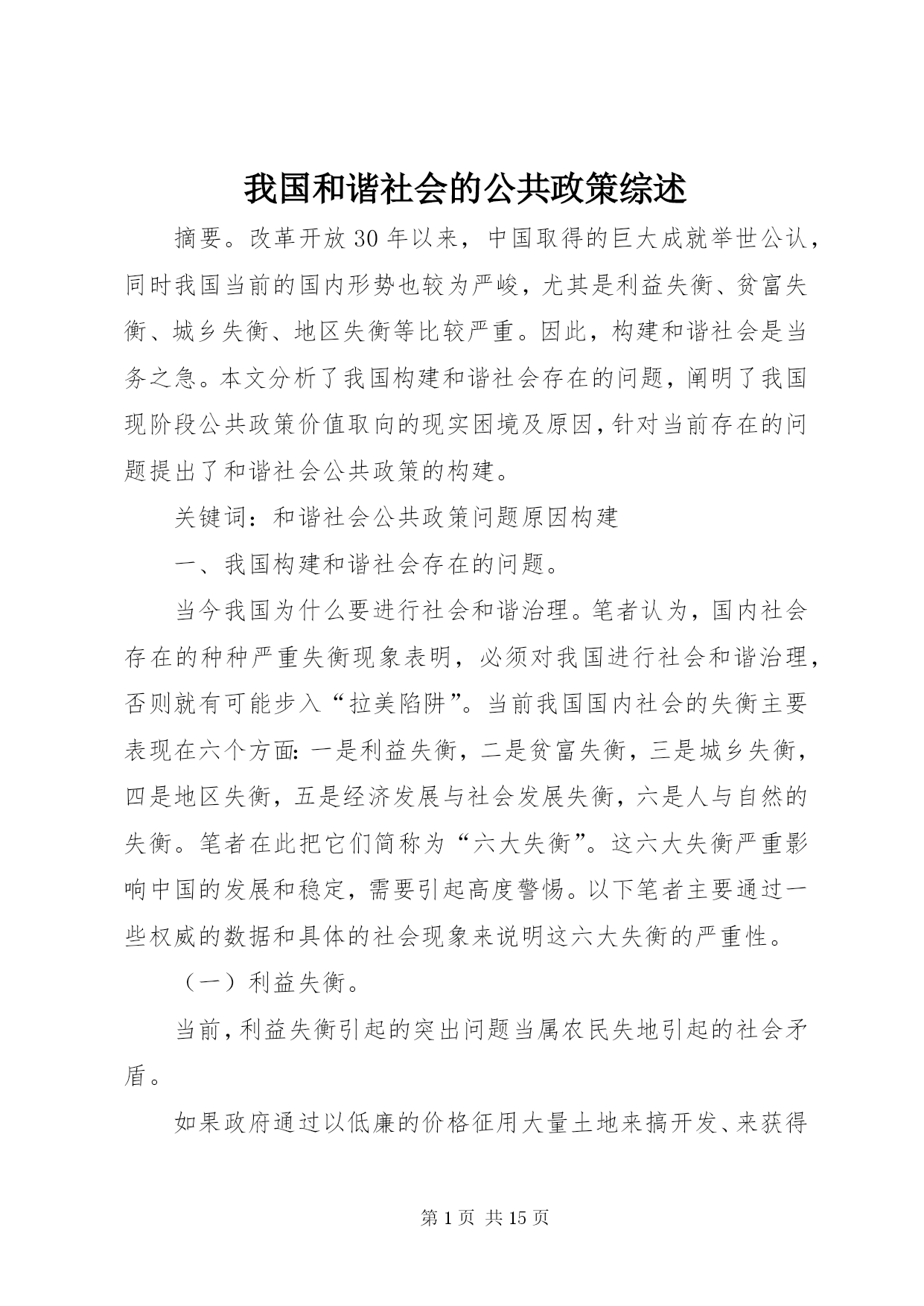 第PAGE\*Arabic\*MERGEFORMAT15页共NUMPAGES\*MERGEFORMAT15页我国和谐社会的公共政策综述摘要。改革开放30年以来,中国取得的巨大成就举世公认,同时我国当前的国内形势也较为严峻,尤其是利益失衡、贫富失衡、城乡失衡、地区失衡等比较严重。因此,构建和谐社会是当务之急。本文分析了我国构建和谐社会存在的问题,阐明了我国现阶段公共政策价值取向的现实困境及原因,针对当前存在的问题提出了和谐社会公共政策的构建。关键词:和谐社会公共政策问题原因构建一、我国构建和谐社