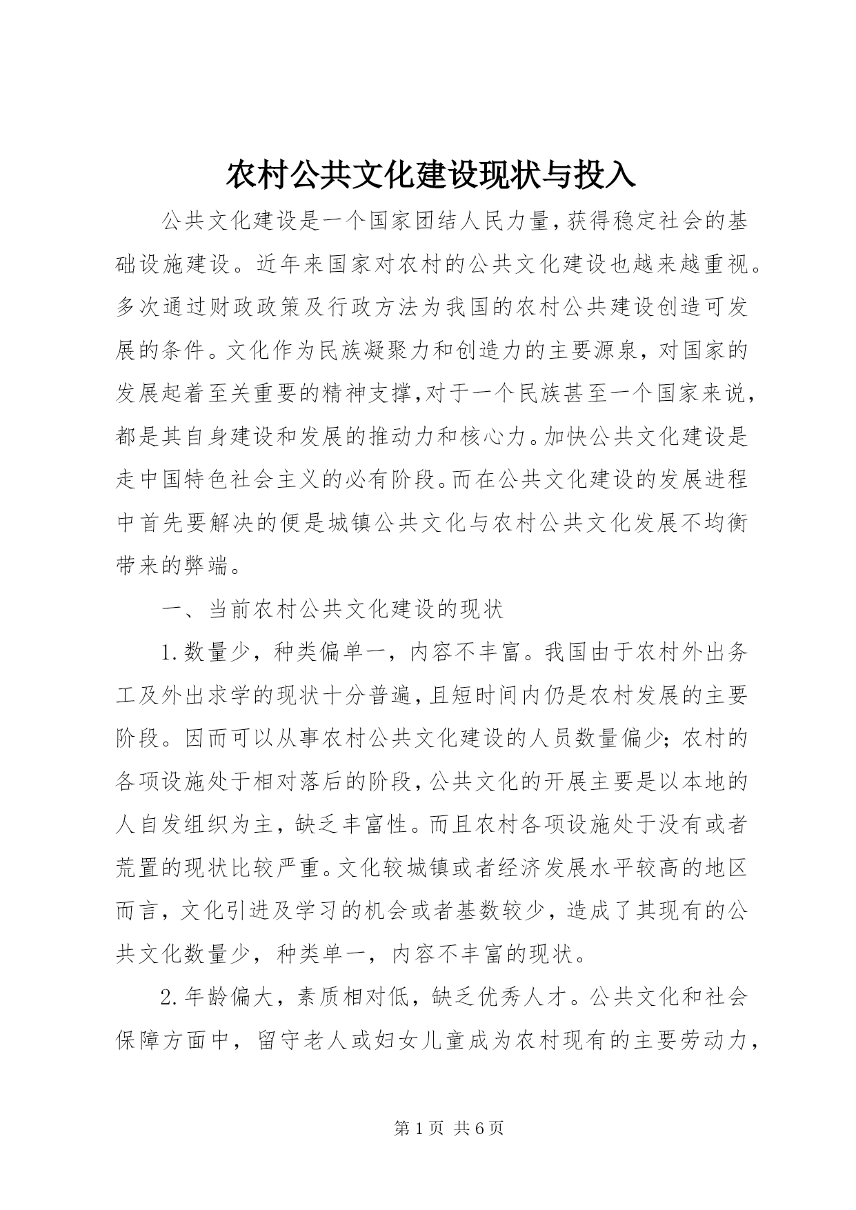第PAGE\*Arabic\*MERGEFORMAT6页共NUMPAGES\*MERGEFORMAT6页农村公共文化建设现状与投入公共文化建设是一个国家团结人民力量,获得稳定社会的基础设施建设。近年来国家对农村的公共文化建设也越来越重视。多次通过财政政策及行政方法为我国的农村公共建设创造可发展的条件。文化作为民族凝聚力和创造力的主要源泉,对国家的发展起着至关重要的精神支撑,对于一个民族甚至一个国家来说,都是其自身建设和发展的推动力和核心力。加快公共文化建设是走中国特色社会主义的必有阶段。而在公