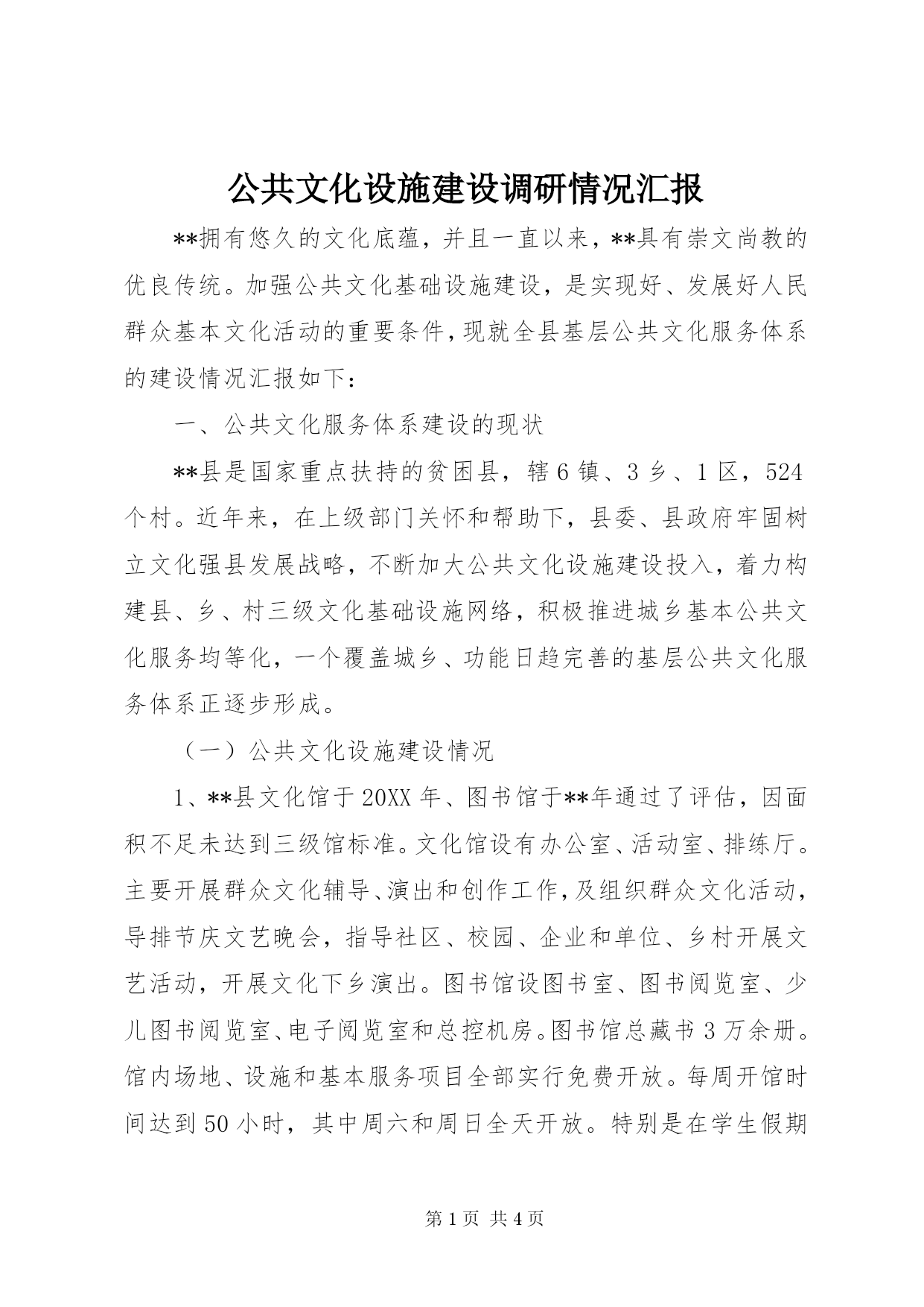 第PAGE\*Arabic\*MERGEFORMAT4页共NUMPAGES\*MERGEFORMAT4页公共文化设施建设调研情况汇报**拥有悠久的文化底蕴,并且一直以来,**具有崇文尚教的优良传统。加强公共文化基础设施建设,是实现好、发展好人民群众基本文化活动的重要条件,现就全县基层公共文化服务体系的建设情况汇报如下:一、公共文化服务体系建设的现状**县是国家重点扶持的贫困县,辖6镇、3乡、1区,524个村。近年来,在上级部门关怀和帮助下,县委、县政府牢固树立文化强县发展战略,不断加大公共文化