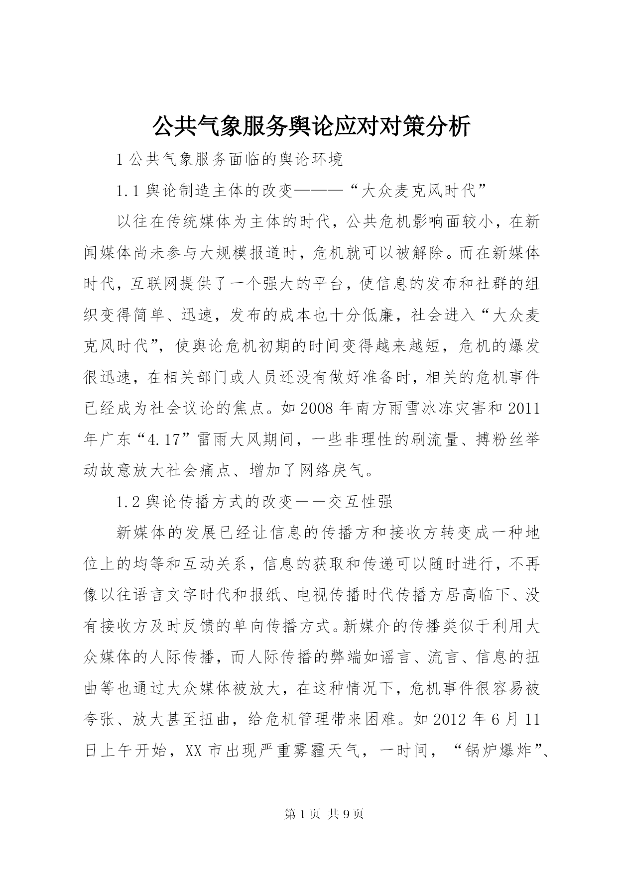 第PAGE\*Arabic\*MERGEFORMAT9页共NUMPAGES\*MERGEFORMAT9页公共气象服务舆论应对对策分析1公共气象服务面临的舆论环境1.1舆论制造主体的改变———“大众麦克风时代”以往在传统媒体为主体的时代,公共危机影响面较小,在新闻媒体尚未参与大规模报道时,危机就可以被解除。而在新媒体时代,互联网提供了一个强大的平台,使信息的发布和社群的组织变得简单、迅速,发布的成本也十分低廉,社会进入“大众麦克风时代”,使舆论危机初期的时间变得越来越短,危机的爆发很迅速,在相关