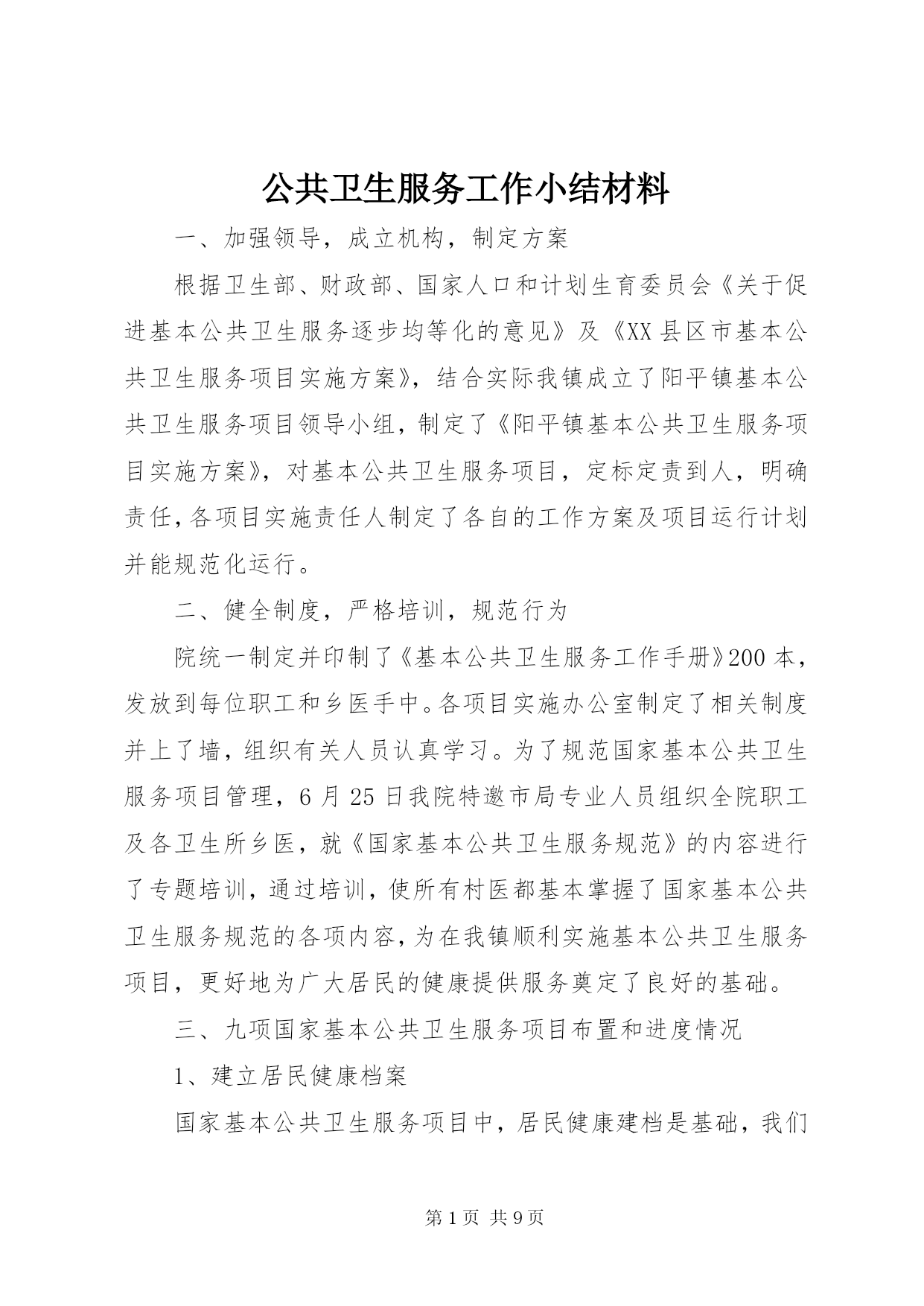 第PAGE\*Arabic\*MERGEFORMAT9页共NUMPAGES\*MERGEFORMAT9页公共卫生服务工作小结材料一、加强领导,成立机构,制定方案根据卫生部、财政部、国家人口和计划生育委员会《关于促进基本公共卫生服务逐步均等化的意见》及《XX县区市基本公共卫生服务项目实施方案》,结合实际我镇成立了阳平镇基本公共卫生服务项目领导小组,制定了《阳平镇基本公共卫生服务项目实施方案》,对基本公共卫生服务项目,定标定责到人,明确责任,各项目实施责任人制定了各自的工作方案及项目运行计划并能规