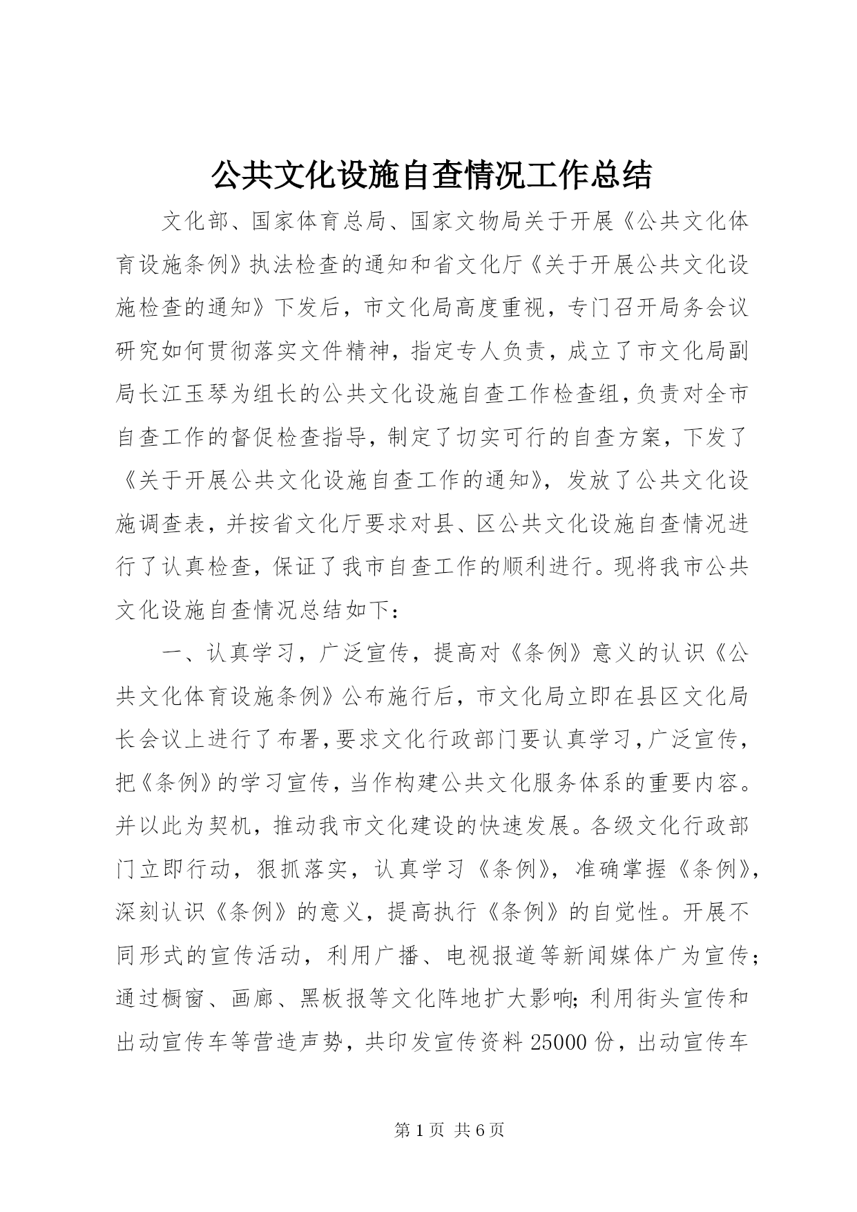 第PAGE\*Arabic\*MERGEFORMAT6页共NUMPAGES\*MERGEFORMAT6页公共文化设施自查情况工作总结文化部、国家体育总局、国家文物局关于开展《公共文化体育设施条例》执法检查的通知和省文化厅《关于开展公共文化设施检查的通知》下发后,市文化局高度重视,专门召开局务会议研究如何贯彻落实文件精神,指定专人负责,成立了市文化局副局长江玉琴为组长的公共文化设施自查工作检查组,负责对全市自查工作的督促检查指导,制定了切实可行的自查方案,下发了《关于开展公共文化设施自查工作的通